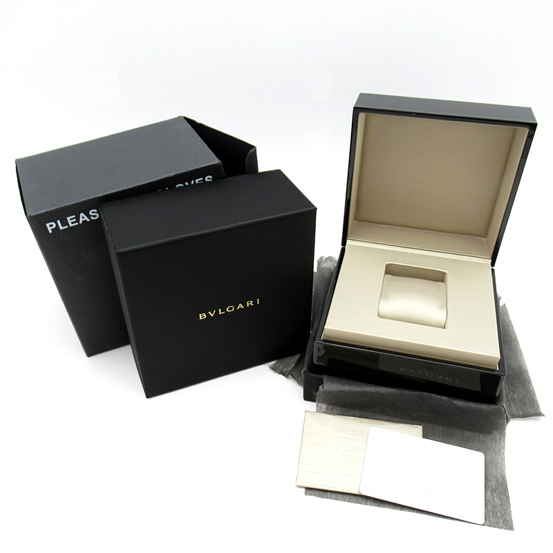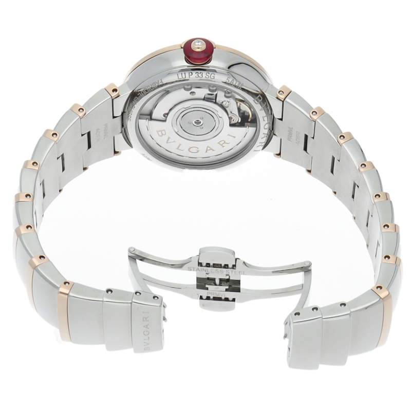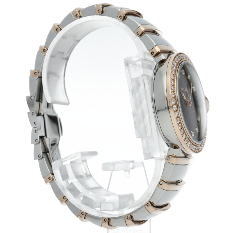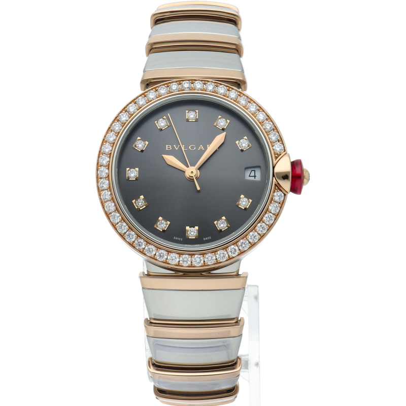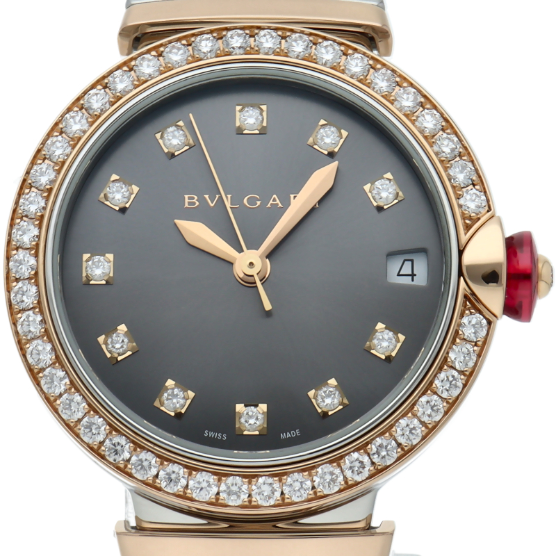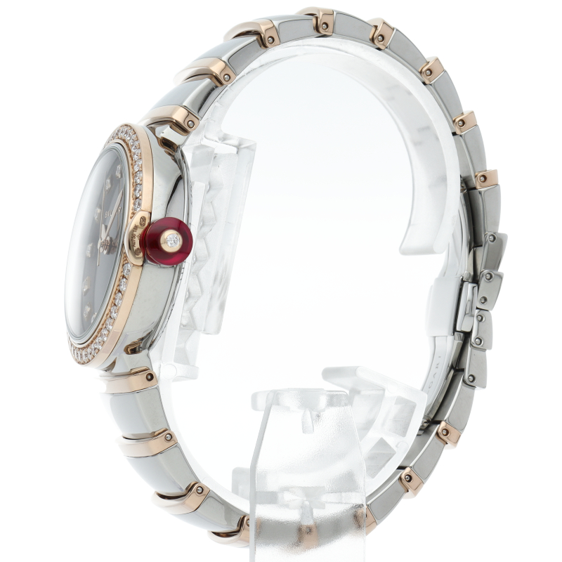 イタリア語で「光」を表すルーチェと、ラテン語のルクスから名づけられた「ルチェア」。リューズにはカボッションカットのピンクストーンとダイヤモンドがあしらわれ気品にあふれた一本です。シンプルな円筒形のケースにブルガリらしい斬新なブレスレットが特徴的。