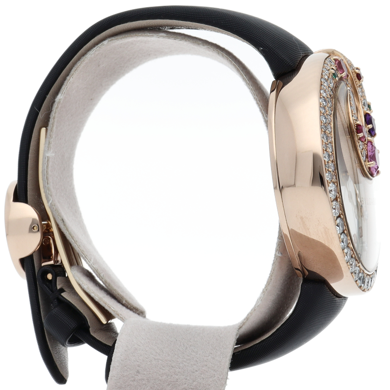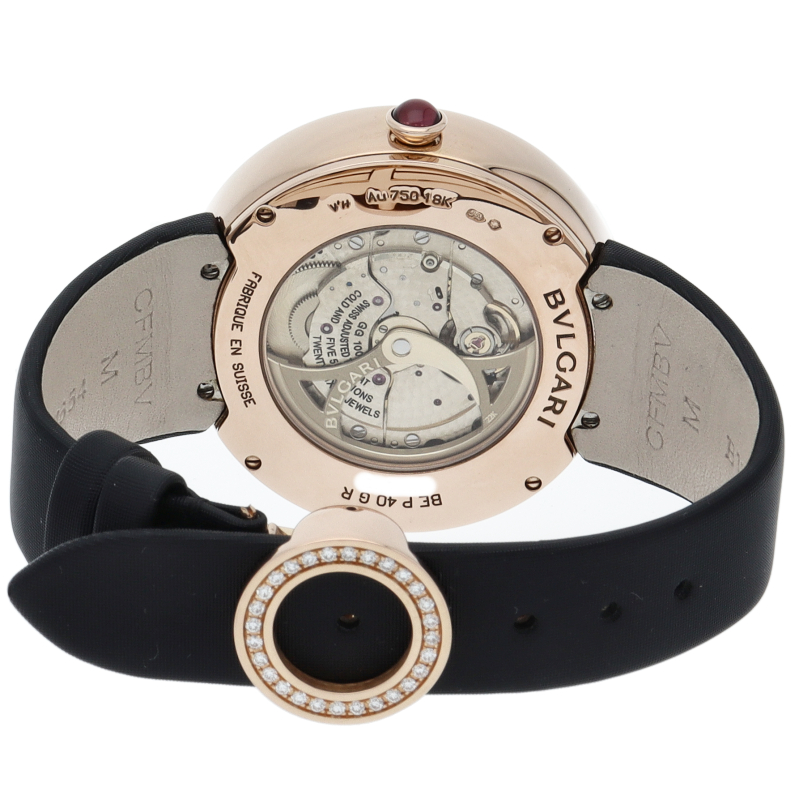 ピンクゴールドとダイヤを贅沢に使用したジュエリーウォッチ「ベリーズ」。ケース径40mmとなりますと大変大きく感じますが、ベルトにはブラックのレザーが使用され装飾を引き立てるため、アクセサリー感覚で着用いただけます。BEP40WGD2LR。