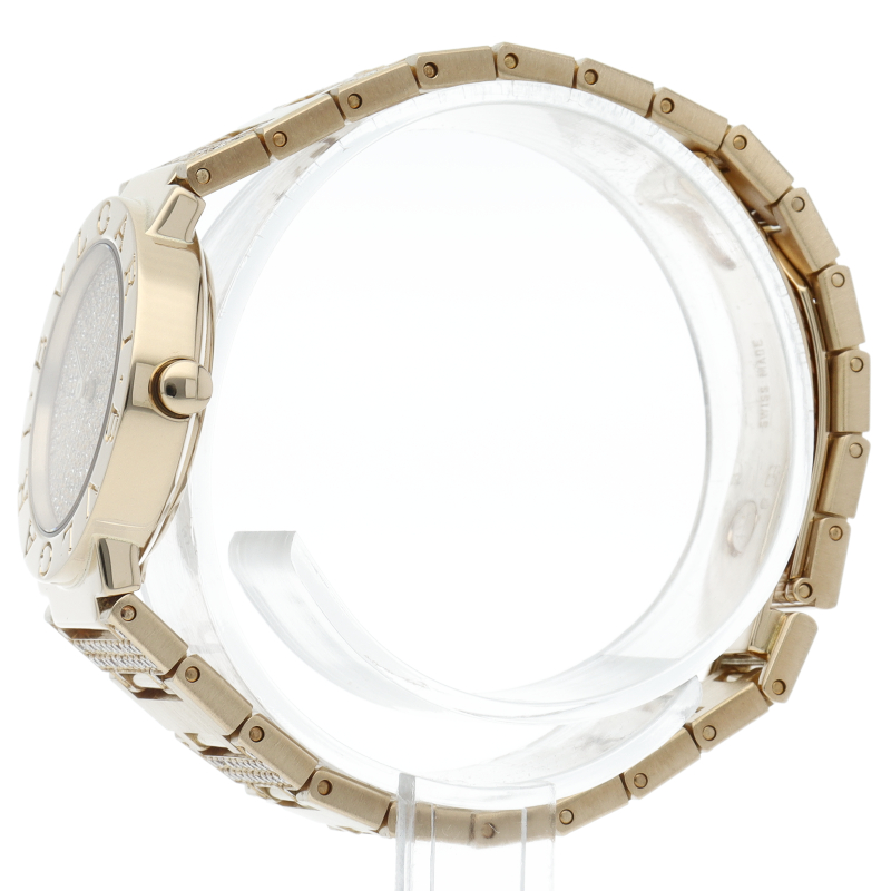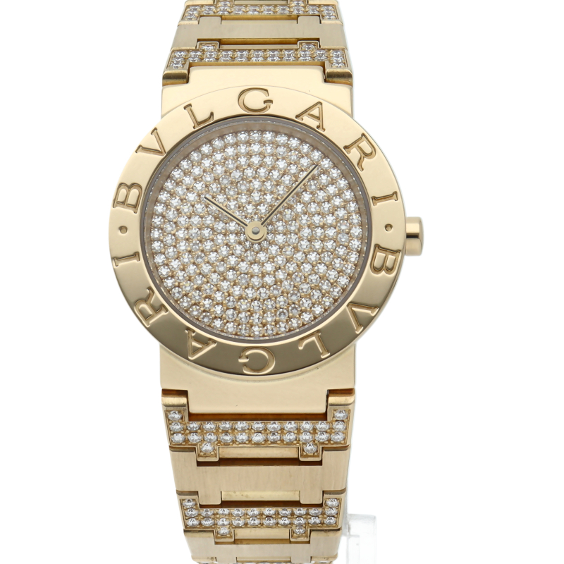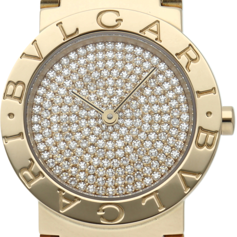 ブルガリを代表する人気シリーズ「ブルガリブルガリ」。ベゼルを囲むように刻まれたブランドロゴとシンプルで上品なデザインが人気です。イエローゴールド仕様と文字盤全面にダイヤが施された高級感溢れる1本。