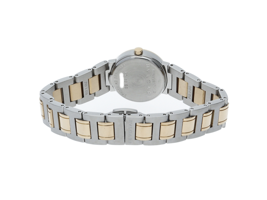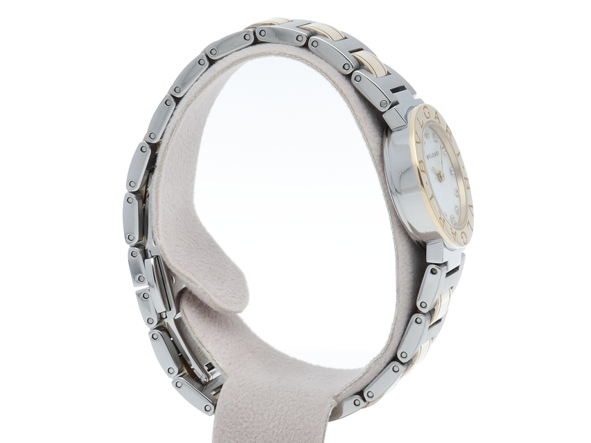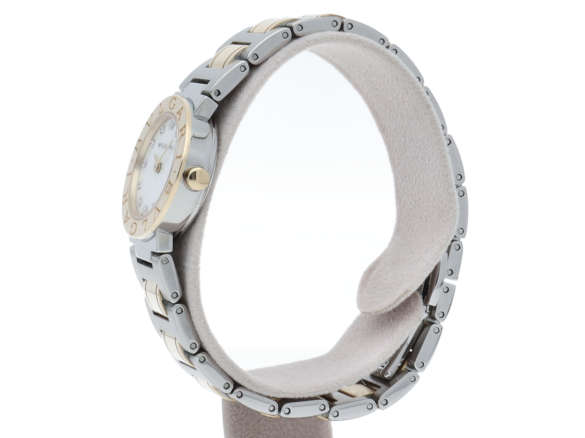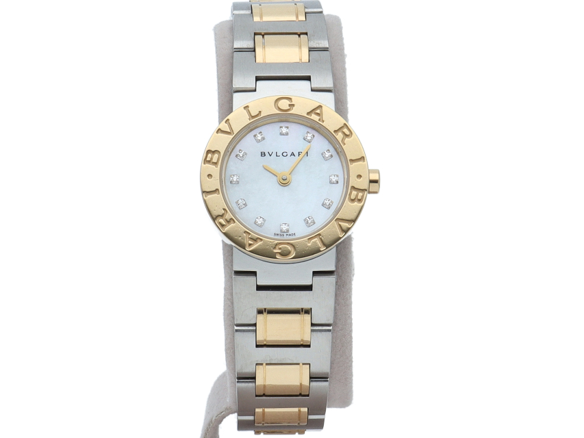ブルガリを代表する人気シリーズ「ブルガリブルガリ」。ベゼルを囲むように刻まれたブランドロゴとシンプルで上品なデザインが人気です。コンビのブレス、ケースにシェルのフェイスをあしらったゴージャスな時計です。BB23SG(BBL23WSPG/12)