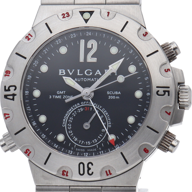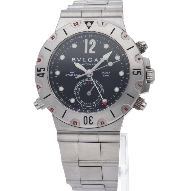 ブルガリの人気ダイバーズウォッチ「スクーバ」。こちらは3ヶ国の時刻を同時に表示可能なGMT機能にデイト表示が搭載された多機能ウォッチです。SD38SGMT(SD38SSDGMT)