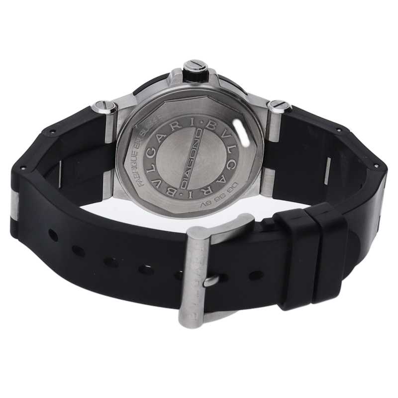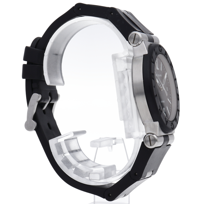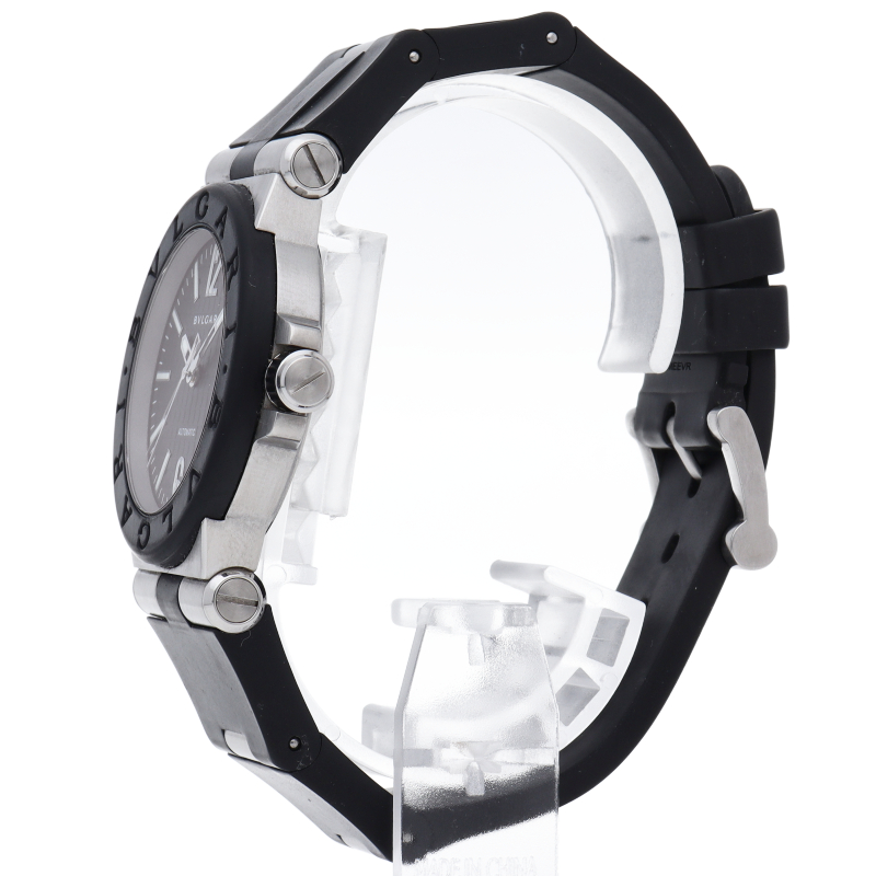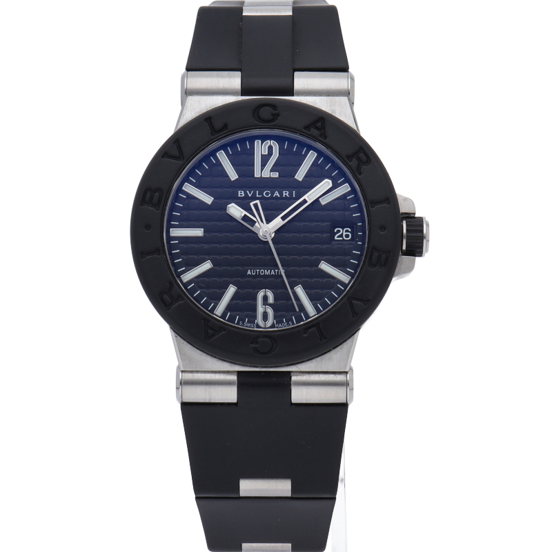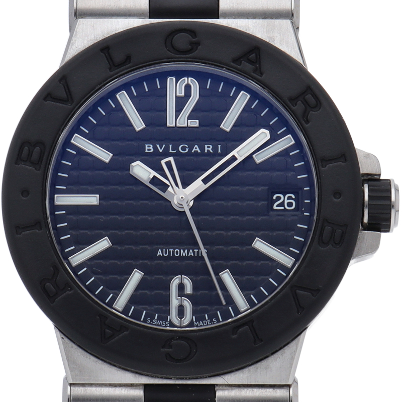 ディアゴノとは「競争する」という意味のギリシャ語にヒントを得て名付けられました。 ひと目でブルガリだとわかる洗練されたベゼルのロゴが特徴です。ベゼルにはセラミックが使用され、実用性はもちろん、ラグジュアリー感も演出しています。DG35SV/DG35BSVD