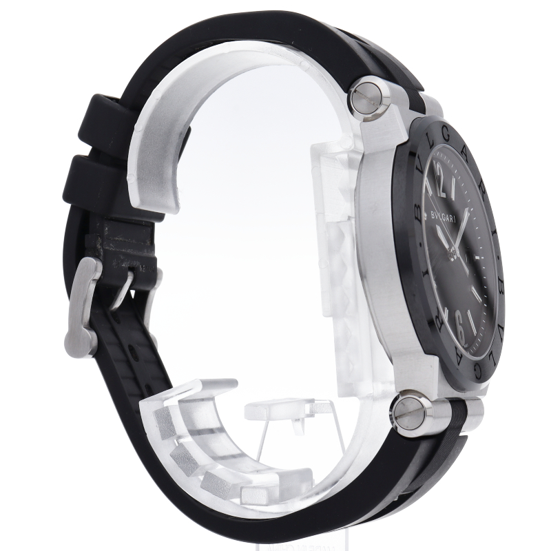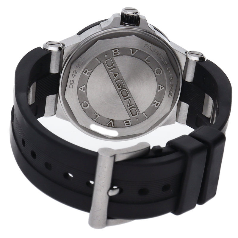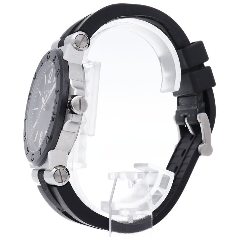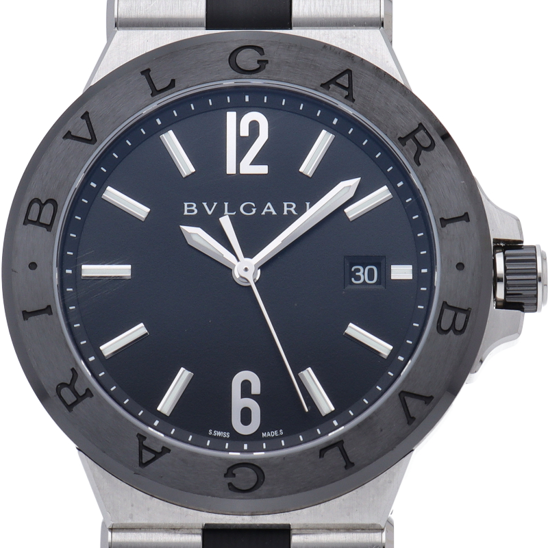 ディアゴノとは「競争する」という意味のギリシャ語にヒントを得て名付けられました。 ひと目でブルガリだとわかる洗練されたベゼルのロゴが特徴です。ベゼルにはセラミックが使用され、実用性はもちろん、ラグジュアリー感も演出しています。DG42SC(102029)