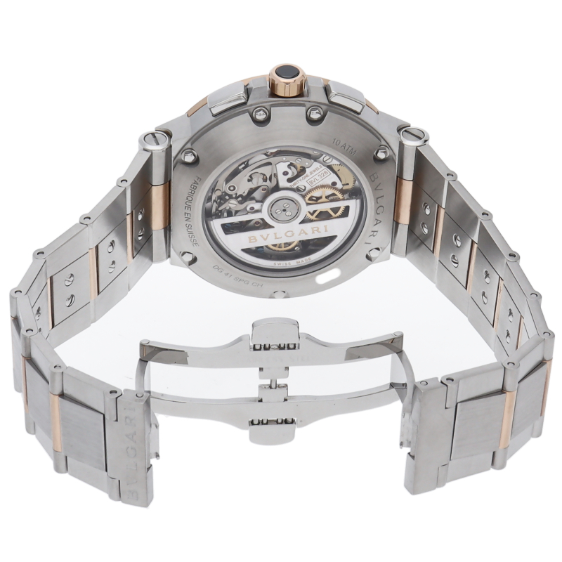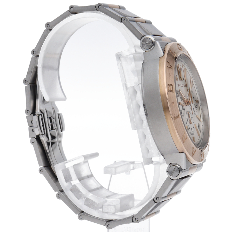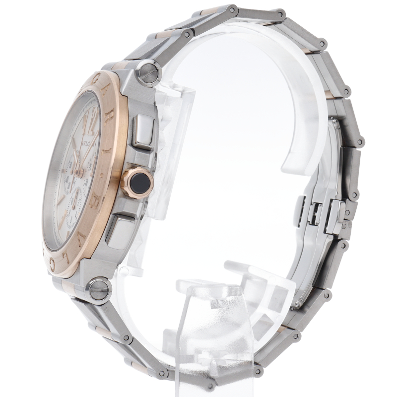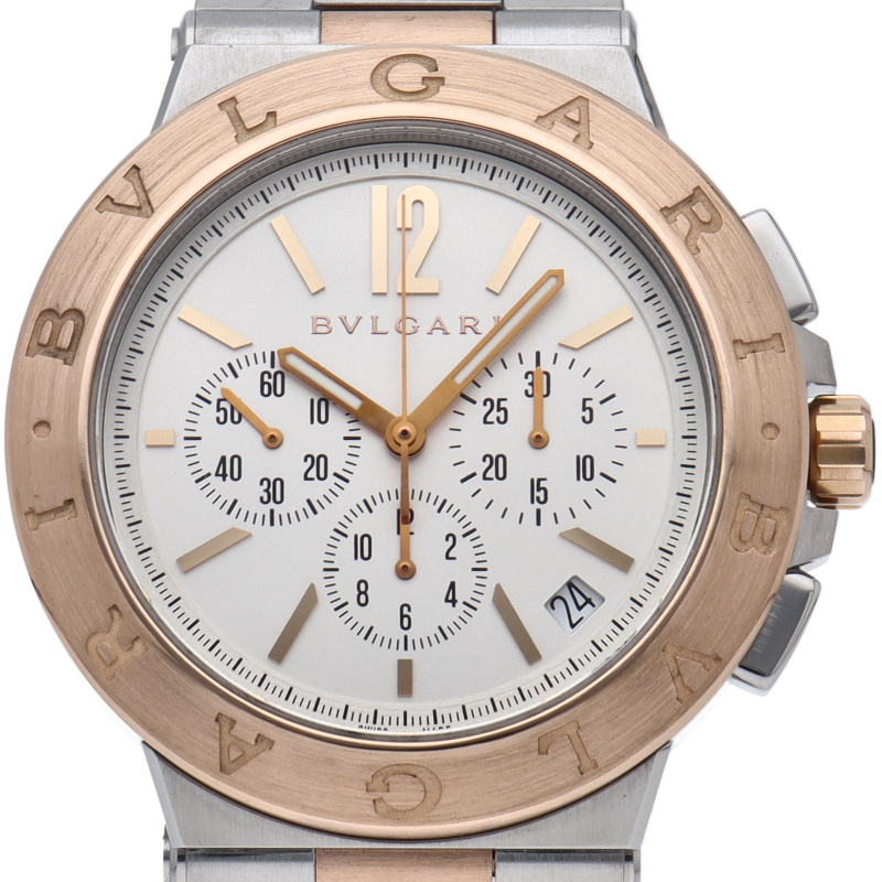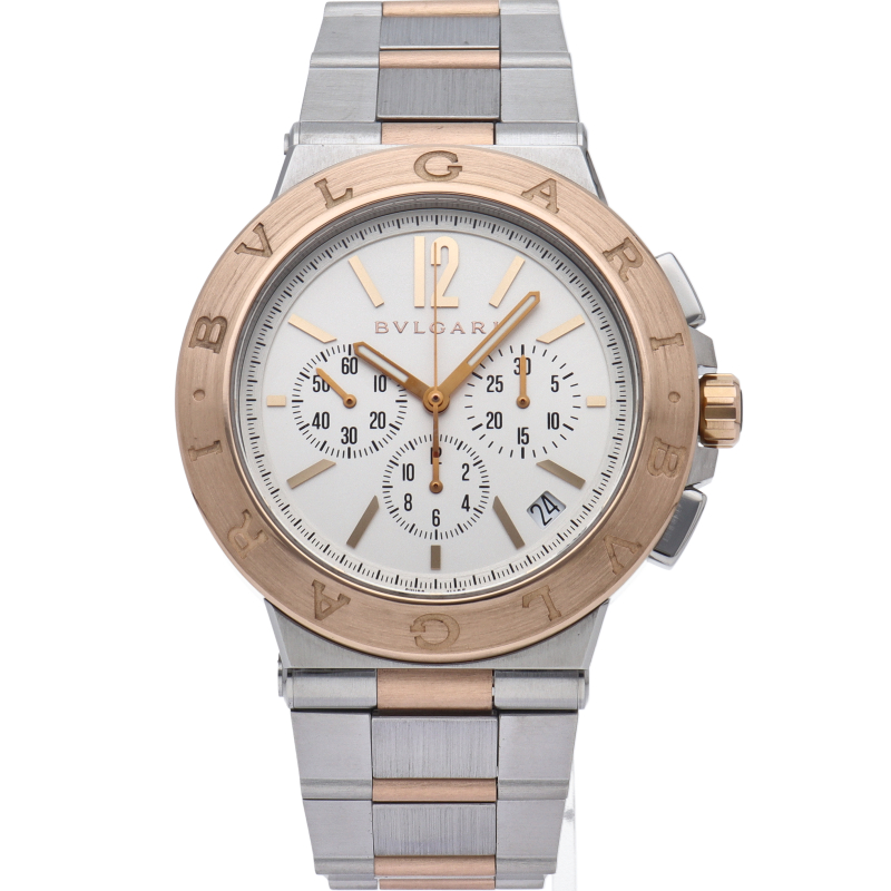 “競争する”を意味する、ギリシャ語のagnをヒントに名づけられたディアゴノ。ベゼルには「BVLGARI」のロゴが刻まれ、一目でブルガリウオッチと分かるようにデザインされています。DG41SPGCH/DG41WSPGDCH。