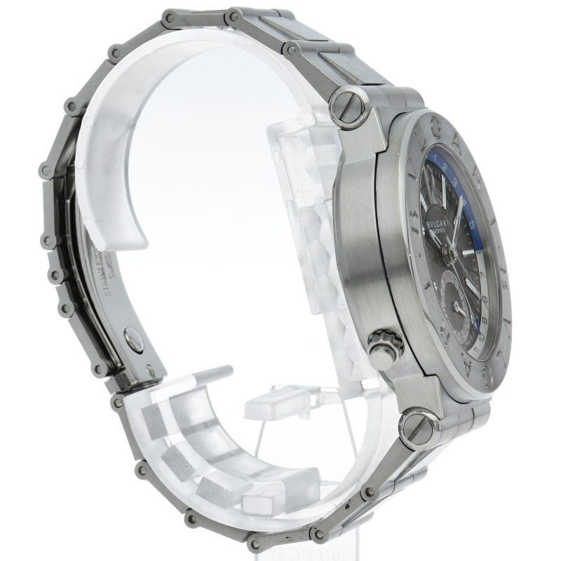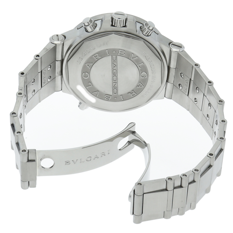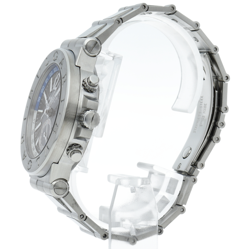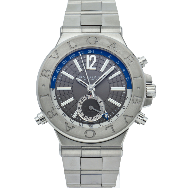 ブルガリのスポーツライン「ディアゴノ」のGMTモデルです。ベゼルにはしっかりとロゴが刻まれ、ブルガリの時計であることをアピール。GMTやデイトの調整も両サイドのプッシャーで簡単に行えます。101633/DG40SGMT。