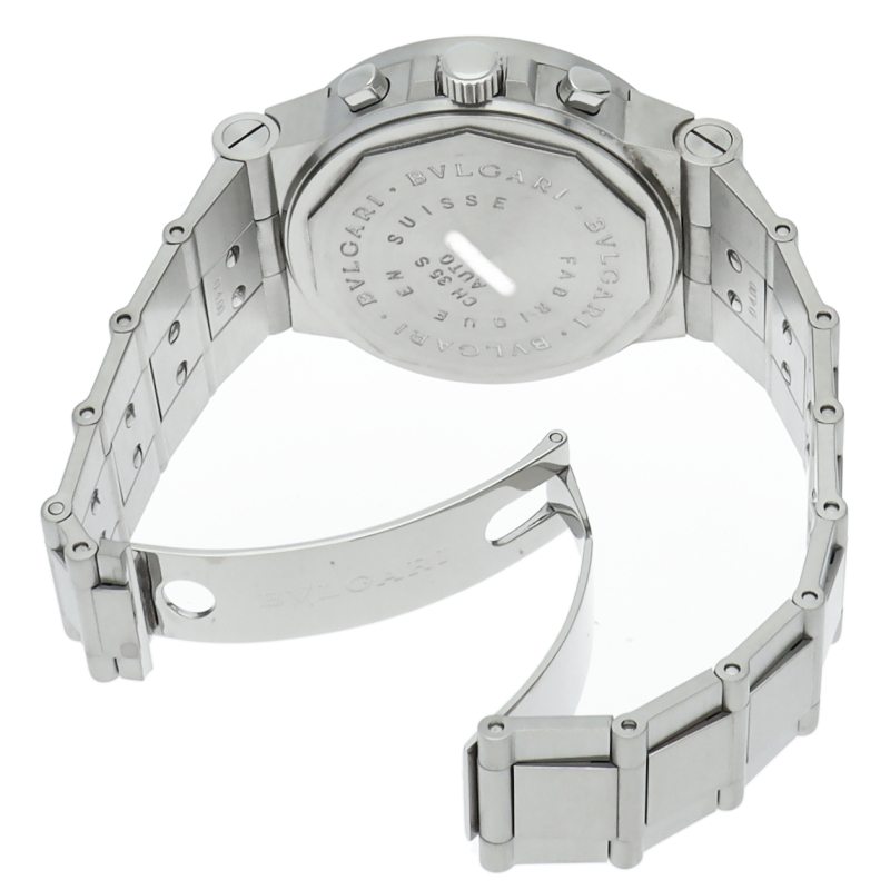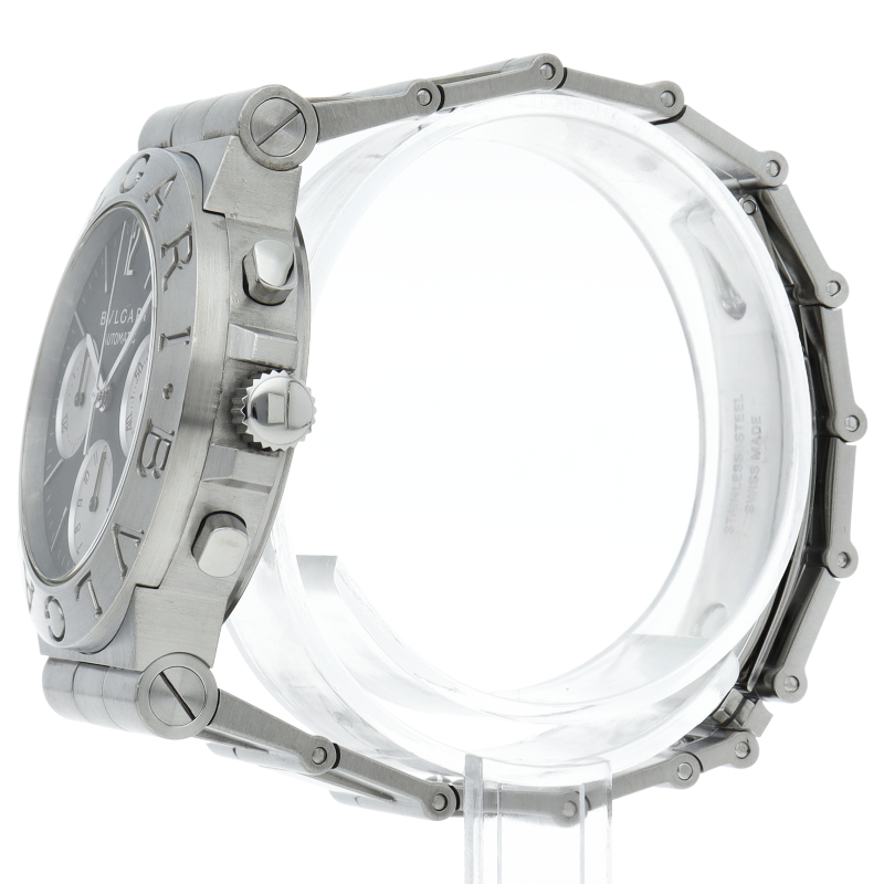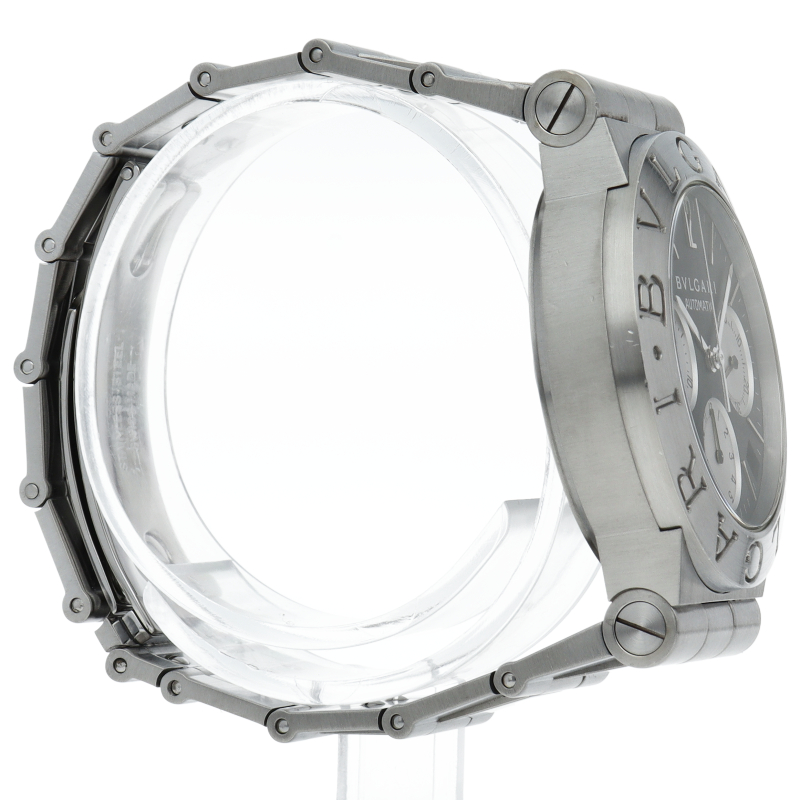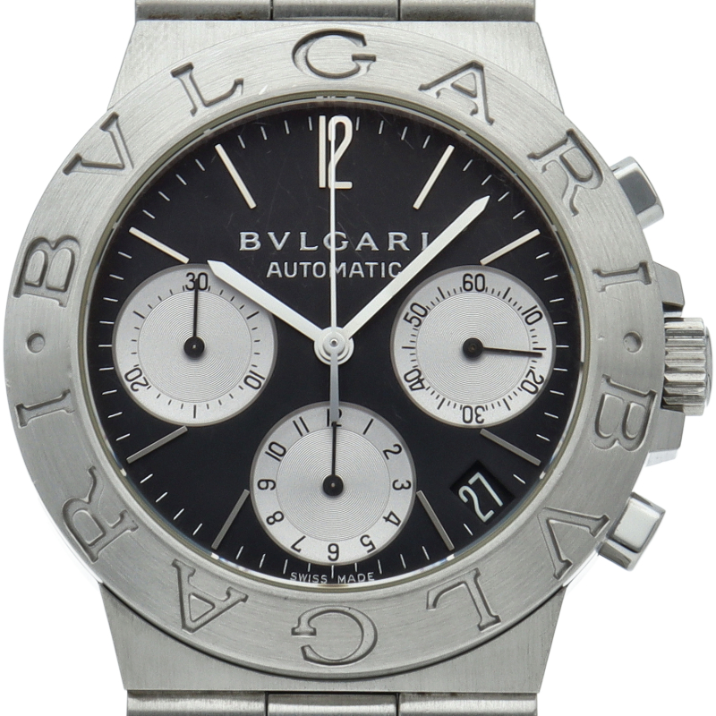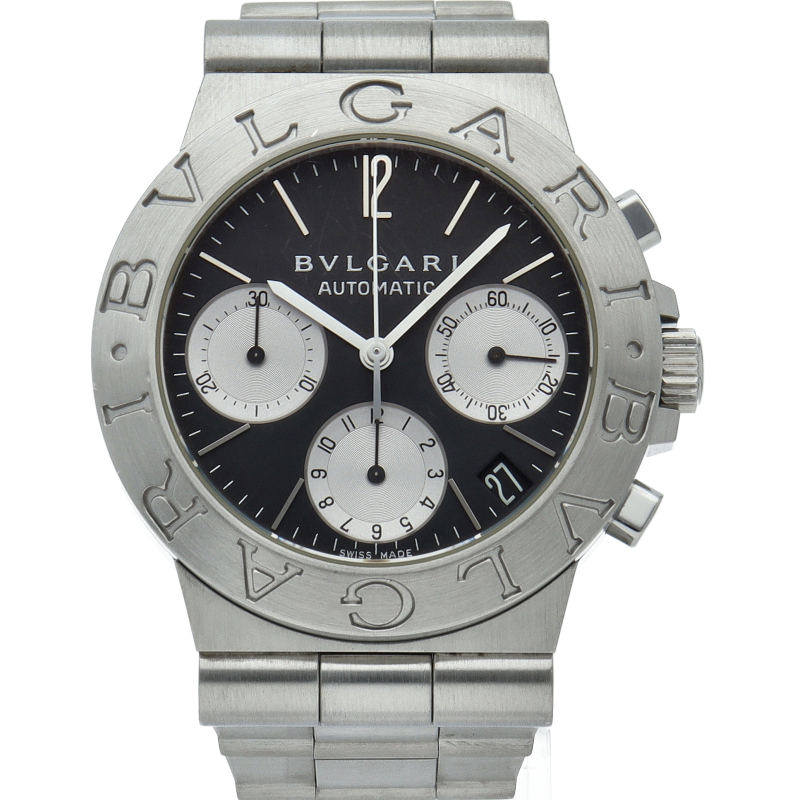 ブルガリでも人気のディアゴノシーリーズ「スポーツクロノグラフ」。スポーティーかつシンプルなデザインにデイト表示・クロノグラフ機構を兼ね備えた1本。