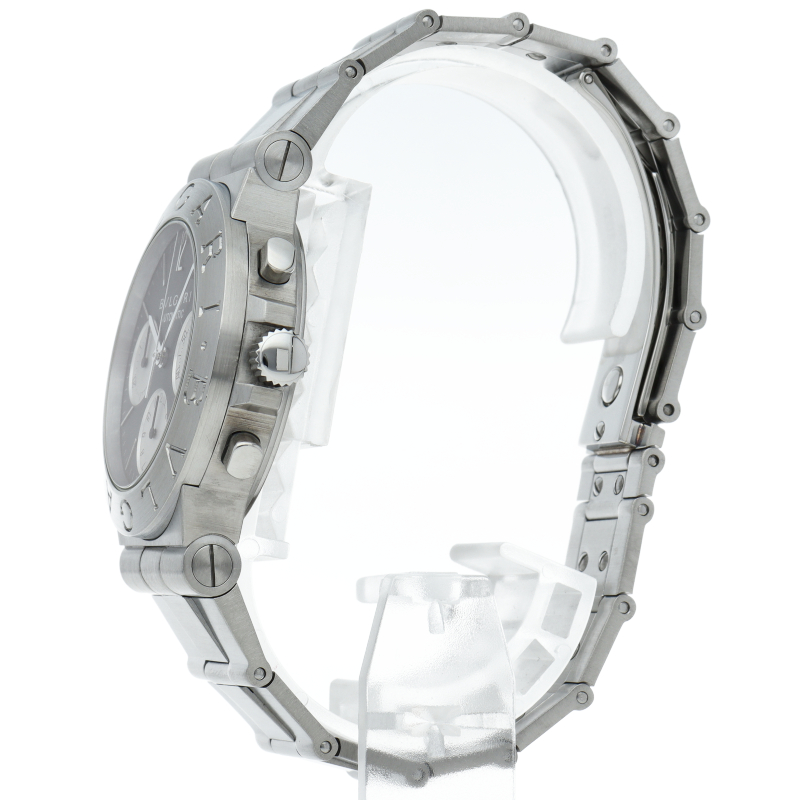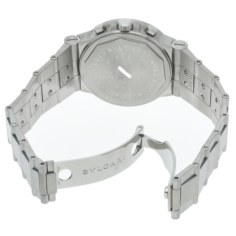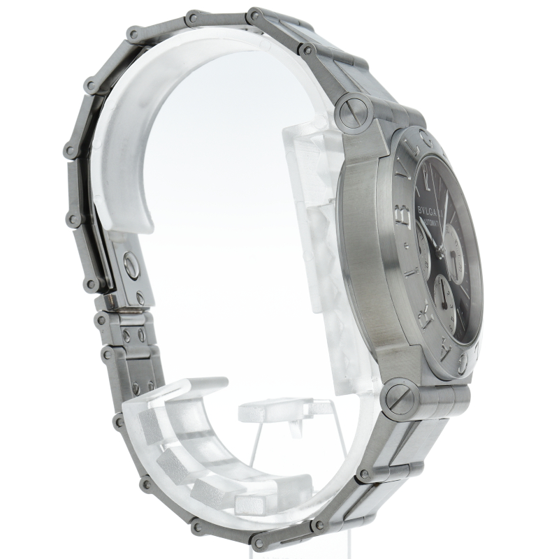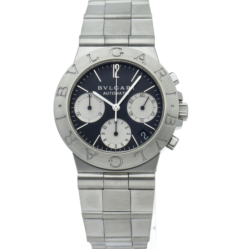 ブルガリでも人気のディアゴノシーリーズ「スポーツクロノグラフ」。スポーティーかつシンプルなデザインにデイト表示・クロノグラフ機構を兼ね備えた1本。