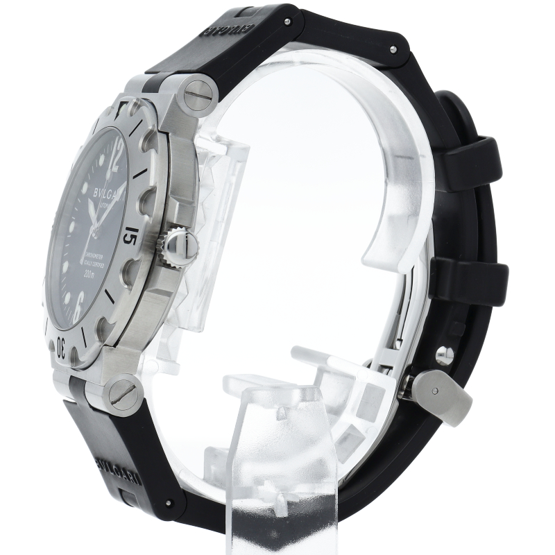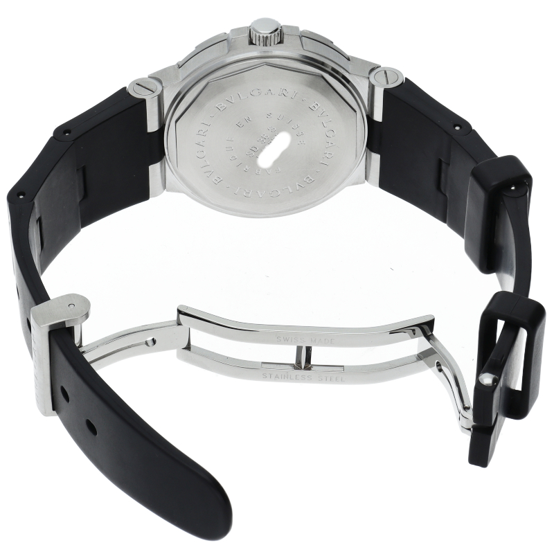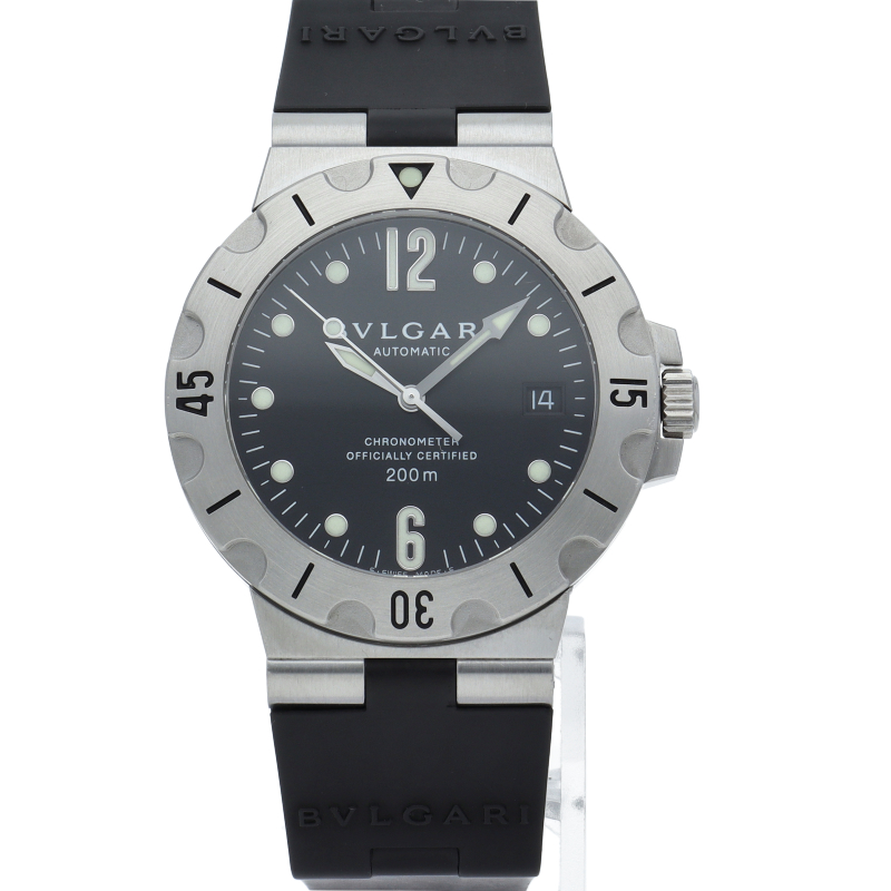 ブルガリの人気ダイバーズウォッチ「スクーバ」。このモデルは、ブルガリの時計の中でも最新技術を使い、特徴的なシリーズとして区別されてるスクーバです。スポーティーでシンプルなダイバーモデルでありながら、エレガントなデザインが爽やかなイメージを与えます。SD38S/SD38SVD