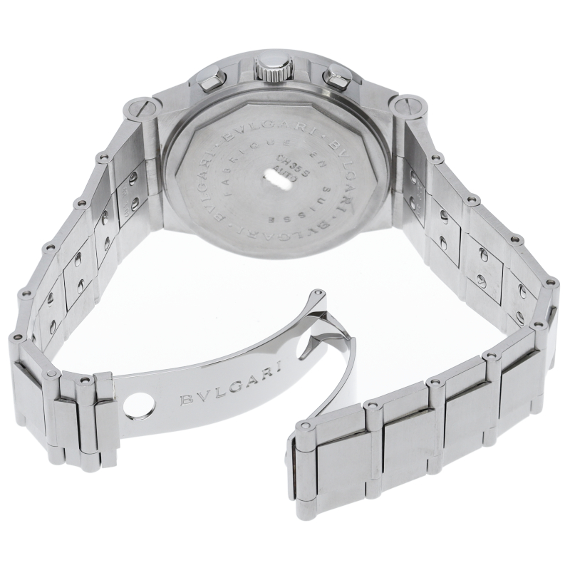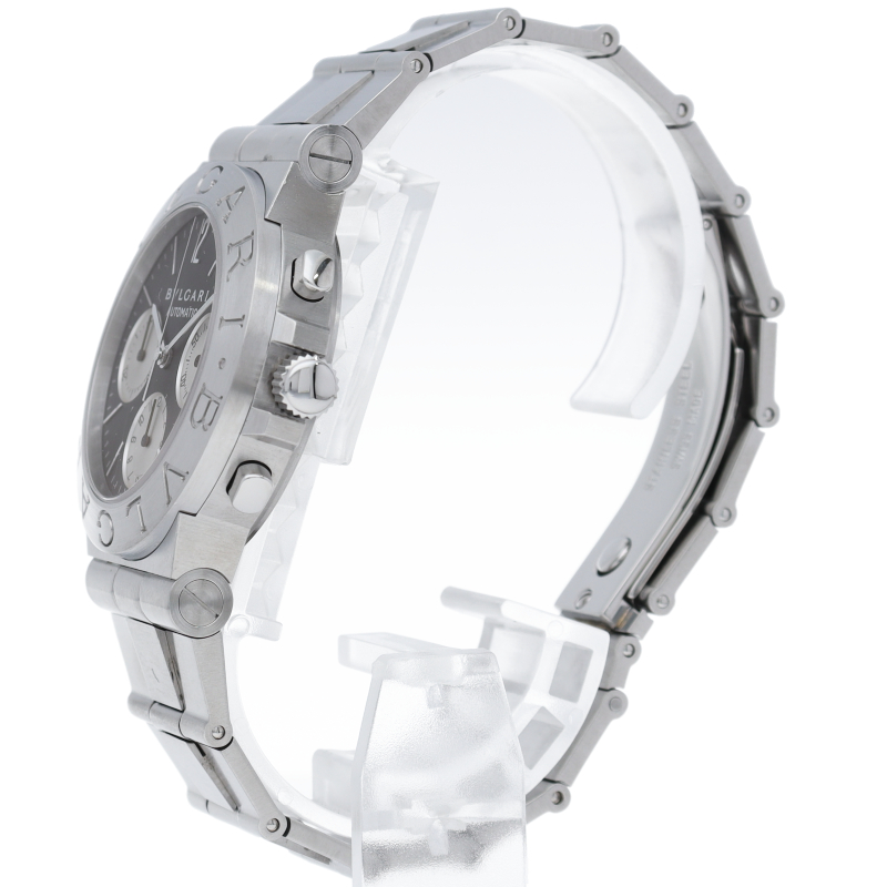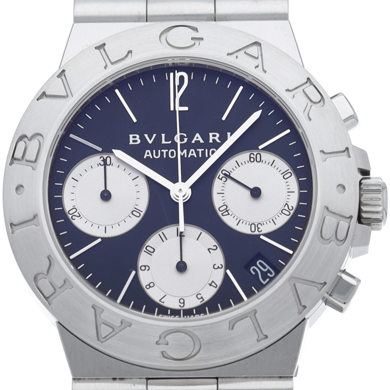 ブルガリでも人気のディアゴノシーリーズ「スポーツクロノグラフ」。スポーティーかつシンプルなデザインにデイト表示・クロノグラフ機構を兼ね備えた1本。
