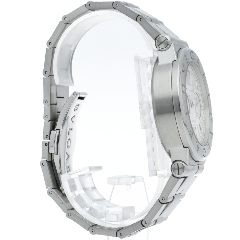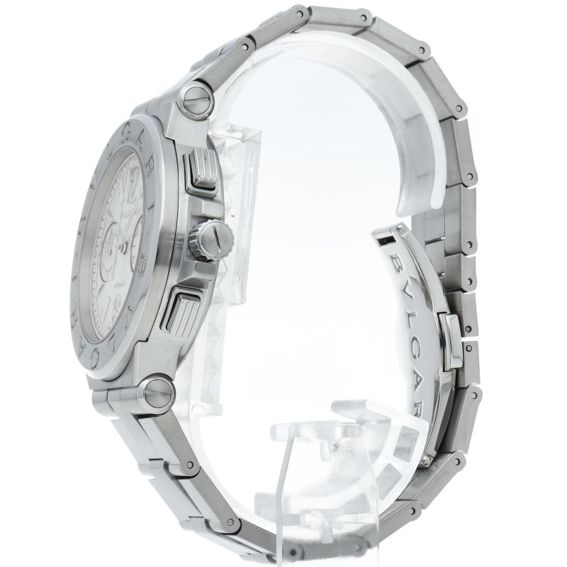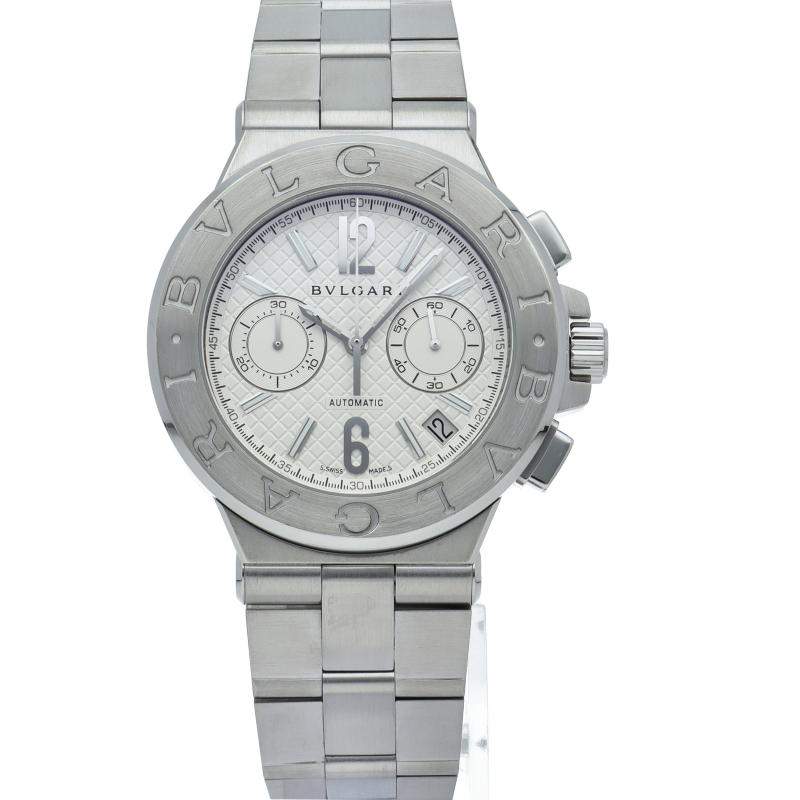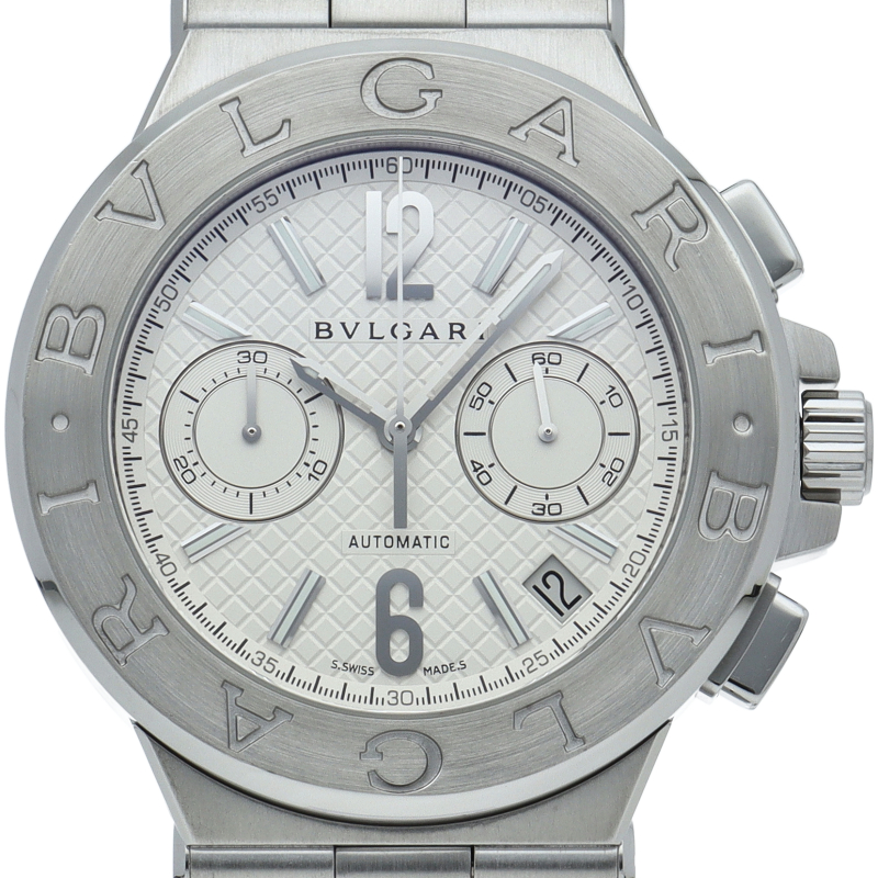 ブルガリでも人気のディアゴノシリーズのクロノグラフです。スポーティーかつシンプルなデザインにデイト表示・クロノグラフ機構を兼ね備えた1本。DG40SCH/DG40BSSDCH。