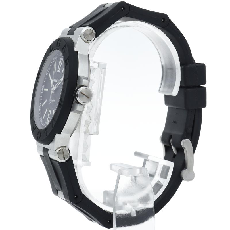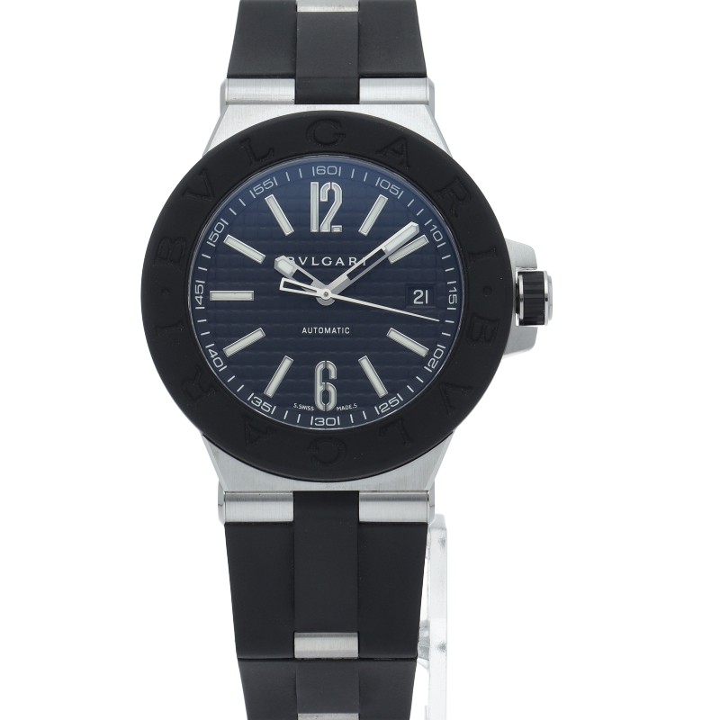ブルガリのスポーティなシリーズ「ディアゴノ」。1988年の誕生以来、ブルガリならではのデザインに高い実用性をプラスした人気シリーズとして展開します。このシリーズは“直線”と“円”の使い方が秀逸で、独特の雰囲気をもったスポーツモデルではないでしょうか。DG40SV/DG40BSVD。