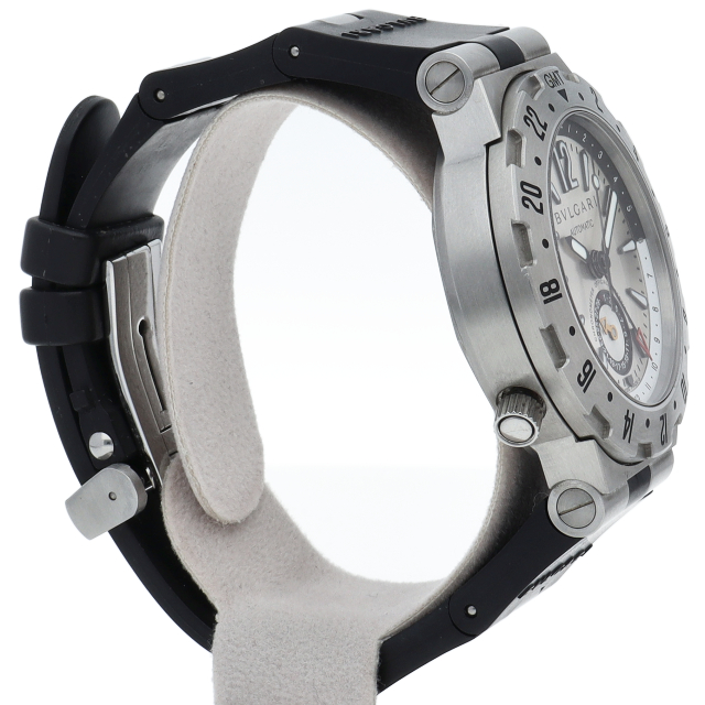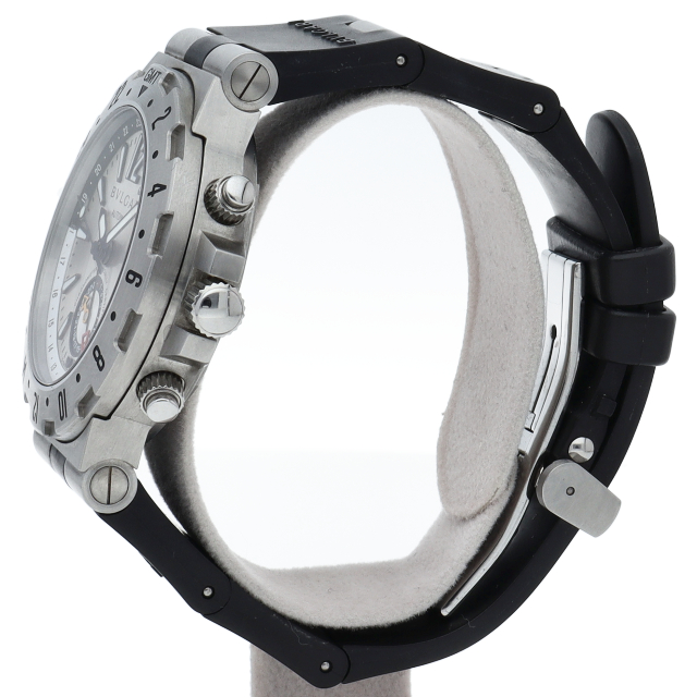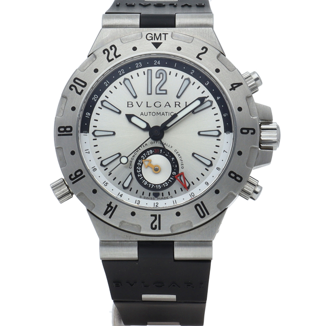 ブルガリの人気シリーズ「ディアゴノ」。シルバーの爽やかさとメタリック感を強調するボディは空をコンセプトに、3つの異なるタイムゾーンを同時に表示できるGMTウォッチですGMT40S(GMT40C5SVD)。