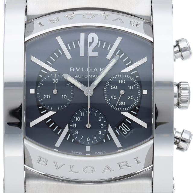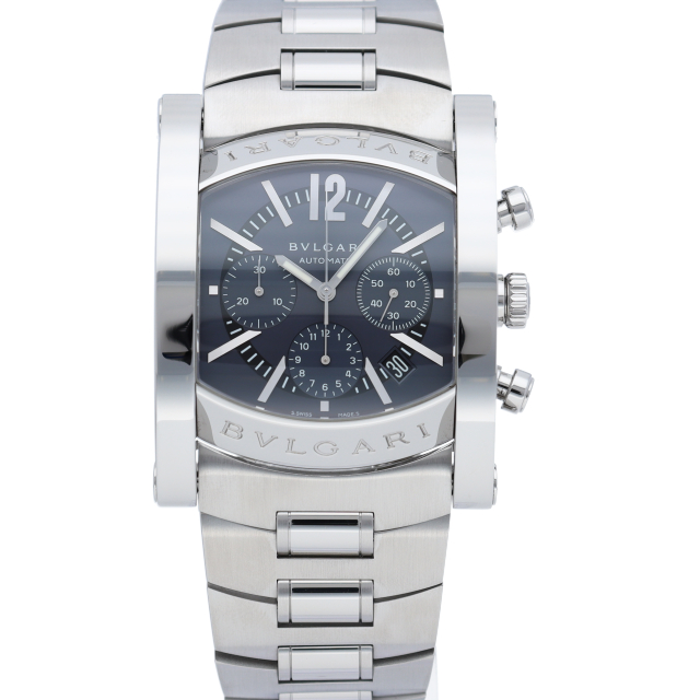その独創的なデザインが人気のアショーマ48。立体的なインデックスや全体の鏡面仕上が上品で高級感ある仕上がりとなっております。クロノグラフ搭載モデル。AA48SCH(AA48BSSDCH)。