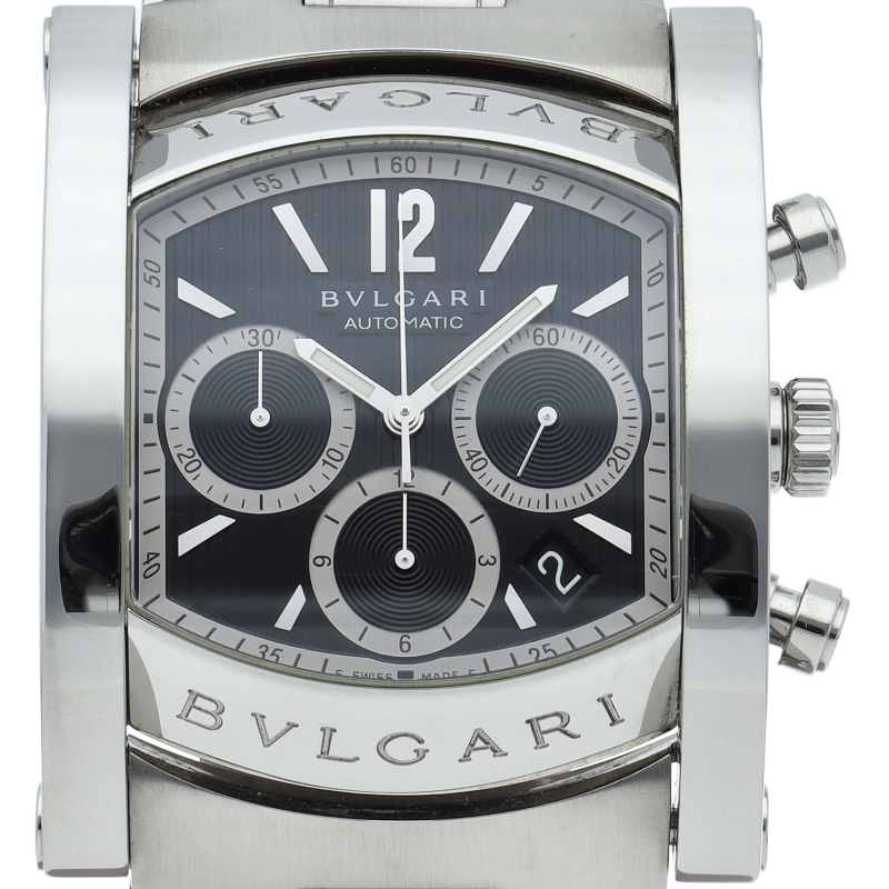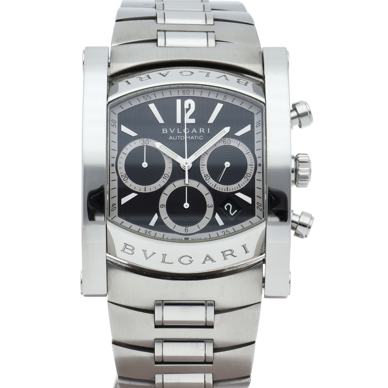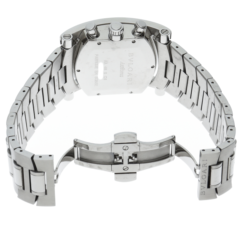 その独創的なデザインが人気のアショーマ48。立体的なインデックスや全体の鏡面仕上が上品で高級感ある仕上がりとなっております。クロノグラフ搭載モデル。AA48SCH/AA48BSSDCH