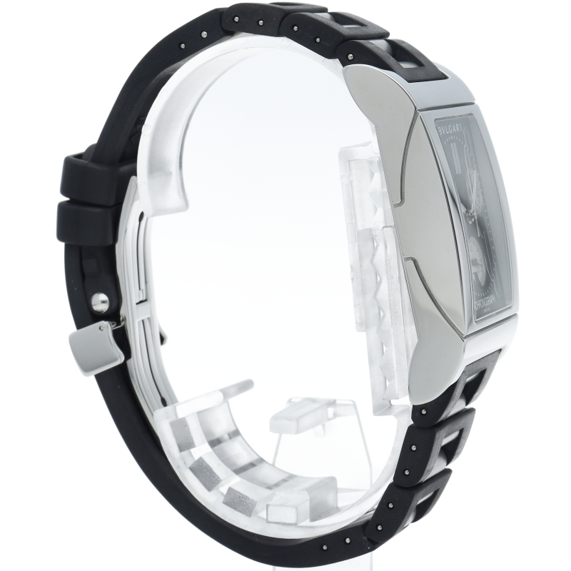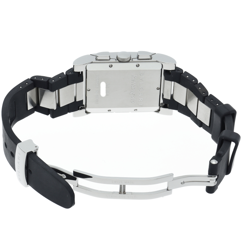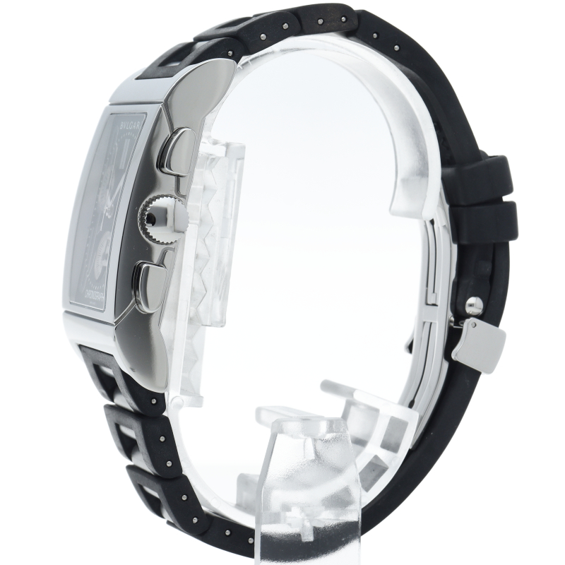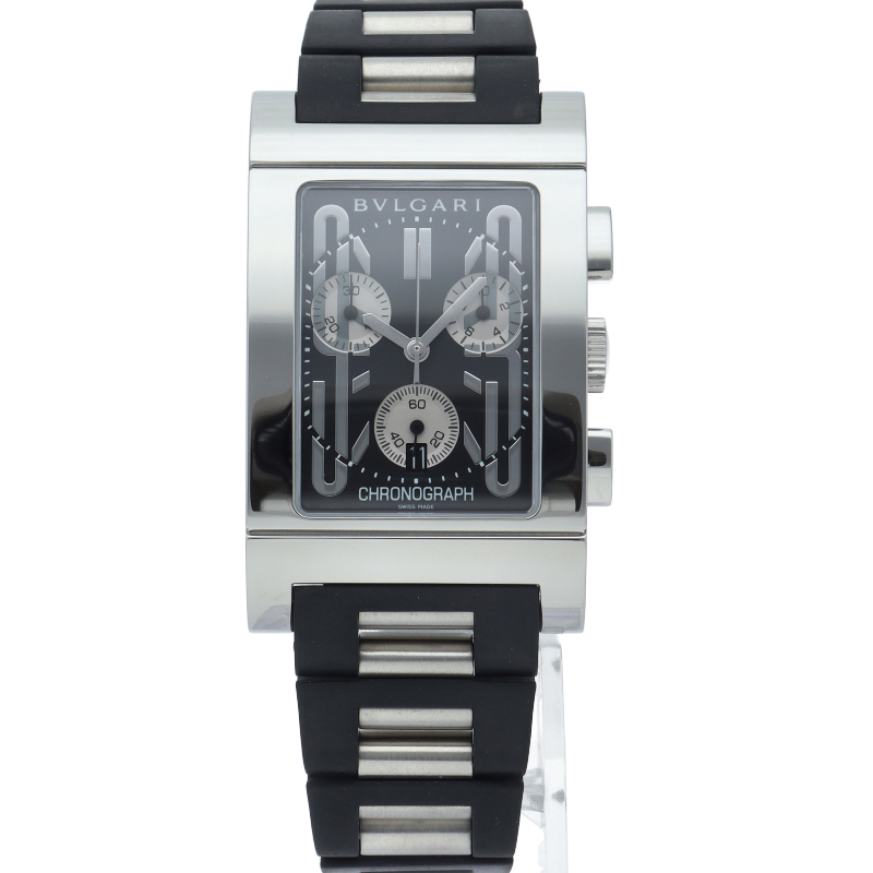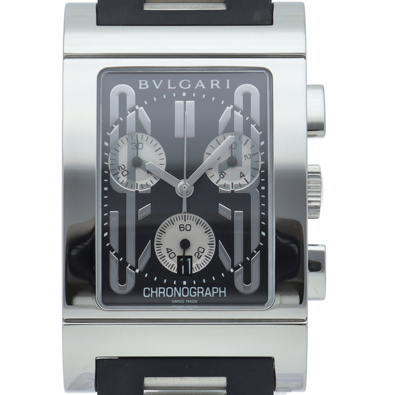 1930年代のイタリアの工業デザインにインスパイアされた独特なデザインが人気のブルガリの「レッタンゴロ」。クロノグラフ機能が付き、実用性も兼ね備えた1本。