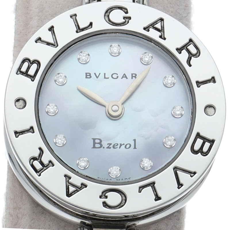 ブルガリの大人気シリーズ「ビーゼロワン」。アクセサリー感覚で着用できるかわいらしい人気ウォッチ。文字盤に12Pダイヤモンドが施された贅沢な1本。BZ22S(BZ22BSS/12)