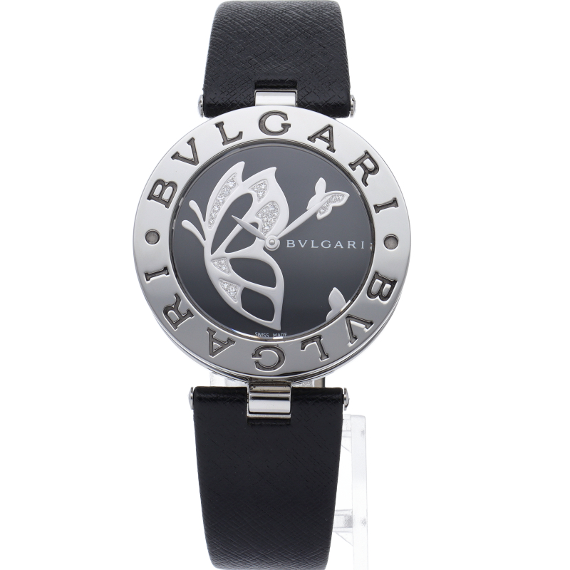 ブルガリの大人気シリーズ「ビーゼロワン」。ブラックダイヤルにはバタフライがデザインされており羽の箇所にはダイヤモンドが散りばめられ、まるでジュエリーのようなモデルに仕上がっております。