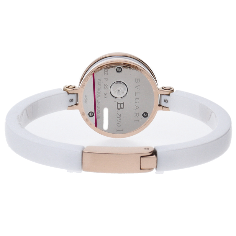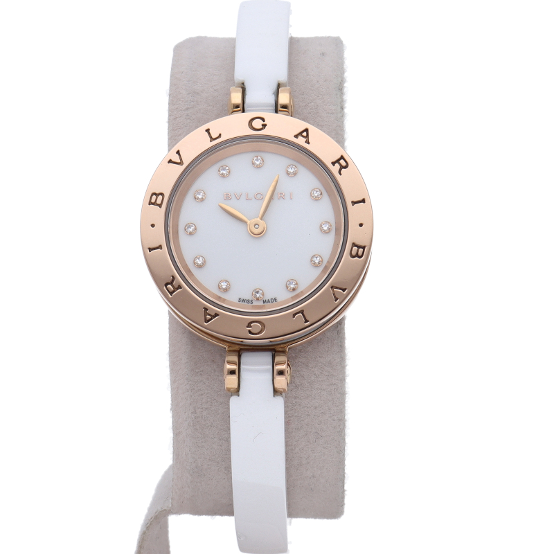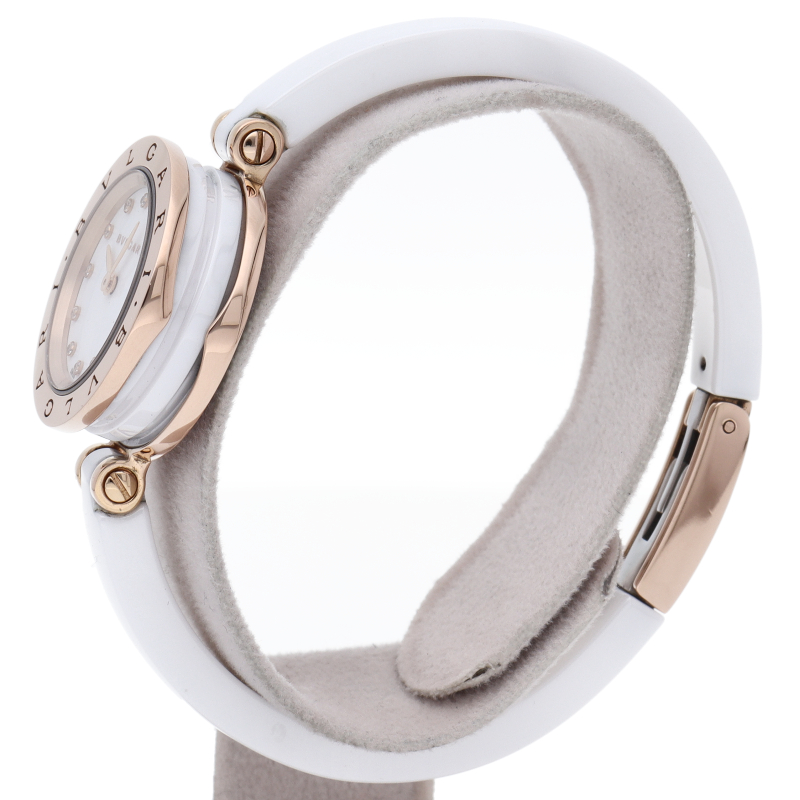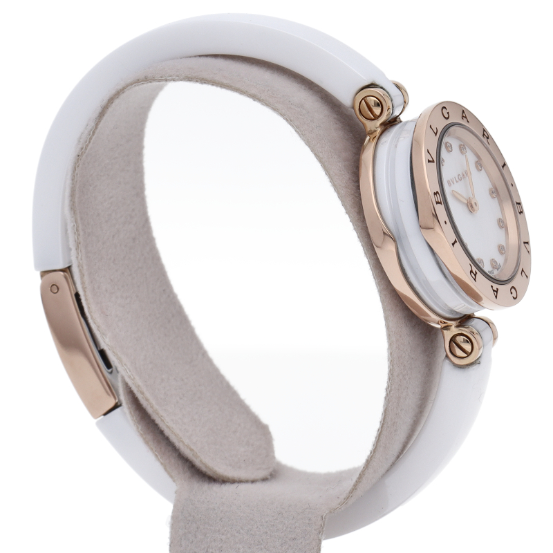 ブルガリの大人気シリーズ「ビーゼロワン」。時計本体はピンクゴールドとセラミック製。ホワイトセラミックに合わせたホワイトの文字盤に、12ポイントの ダイヤモンドが施されています。