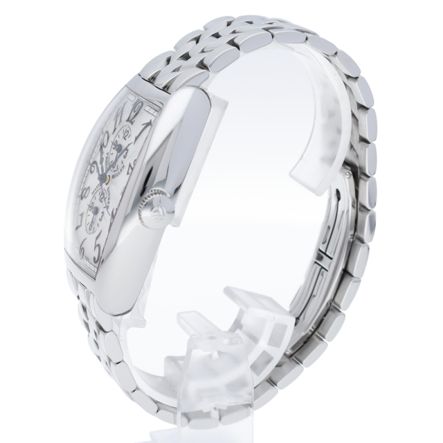 フランクミュラーの3タイムゾーンを表示可能とるする「マスターバンカー」。インダイアルにそれぞれ独立した第二、第三時間帯表示、デイトカレンダーを搭載した自動巻時計です。ギョーシェ彫の美しい細工の文字盤は鑑賞して入れも見飽きません。