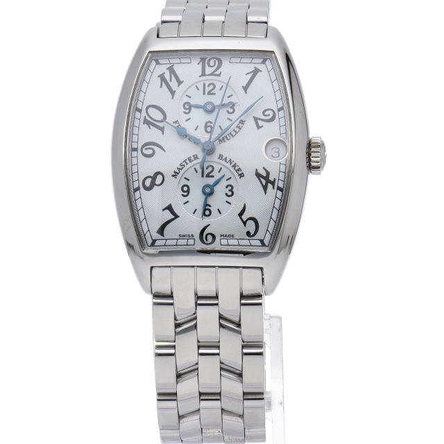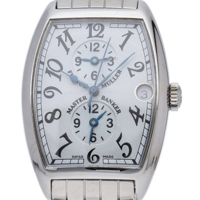フランクミュラーの3タイムゾーンを表示可能とるする「マスターバンカー」。インダイアルにそれぞれ独立した第二、第三時間帯表示、デイトカレンダーを搭載した自動巻時計です。ギョーシェ彫の美しい細工の文字盤は鑑賞して入れも見飽きません。