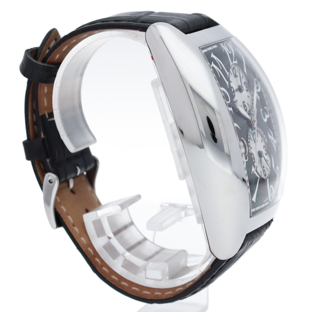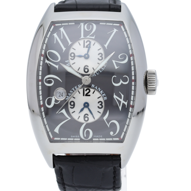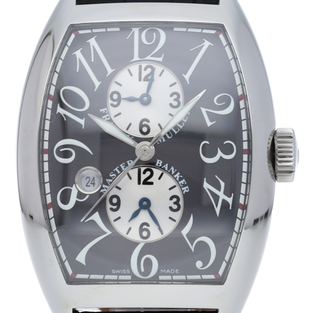 フランクミュラーの3タイムゾーンを表示可能とるする「マスターバンカー」。インダイアルにそれぞれ独立した第二、第三時間帯表示、デイトカレンダーを搭載した自動巻時計です。ギョーシェ彫の美しい細工の文字盤は鑑賞して入れも見飽きません。