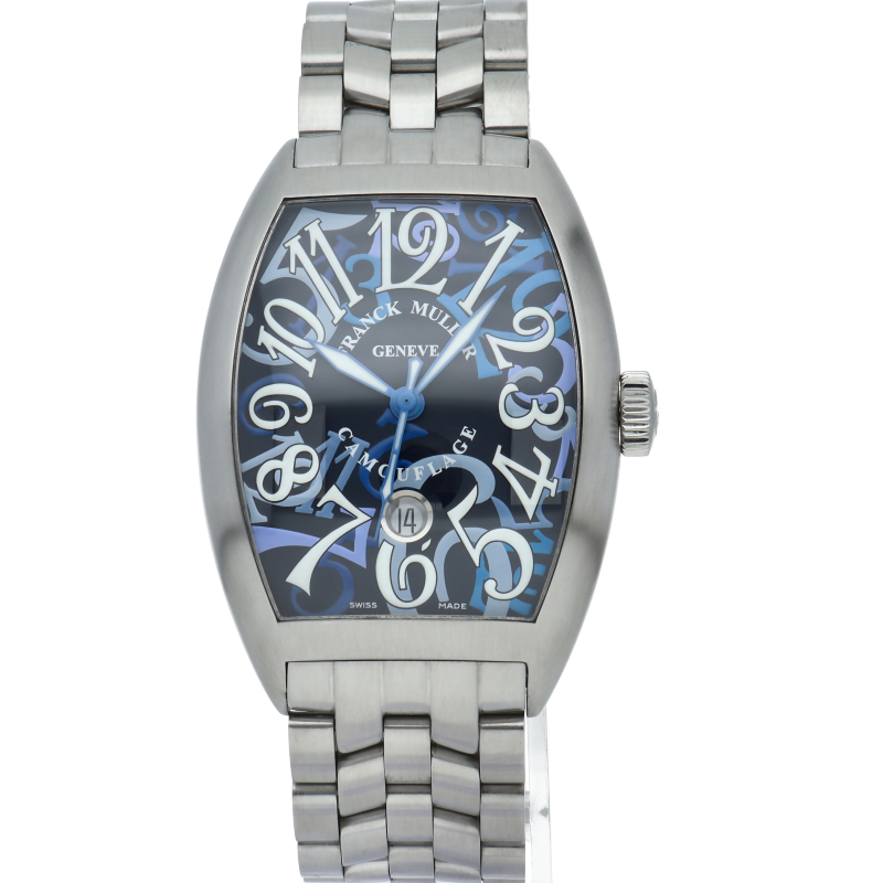 フランク・ミュラーの人気シリーズ「カサブランカ」。日本限定200本。美しい曲線の樽型ケースに、フランクミュラー特有のビザン数字を幾重にも重ねカモフラージュ柄に仕上げたモダンなデザインが特徴的です。8880CDTBR CAMOUFLAGE AC