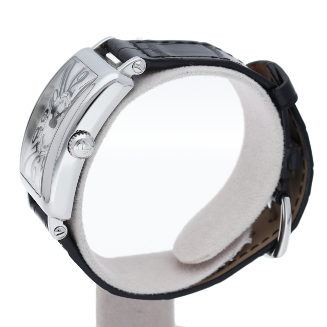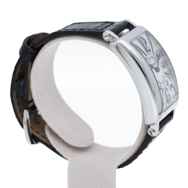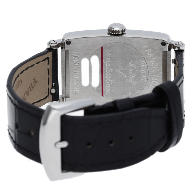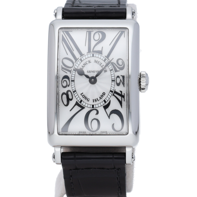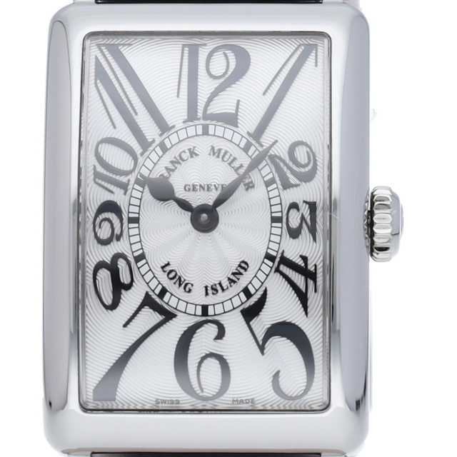 フランクミュラーの中でも特に人気のある「ロングアイランド」。シルバー文字盤とブラックレザーの組み合わせが落ち着いた印象を与える一本です。