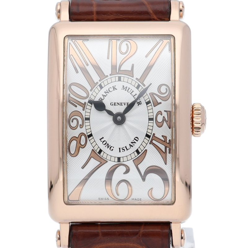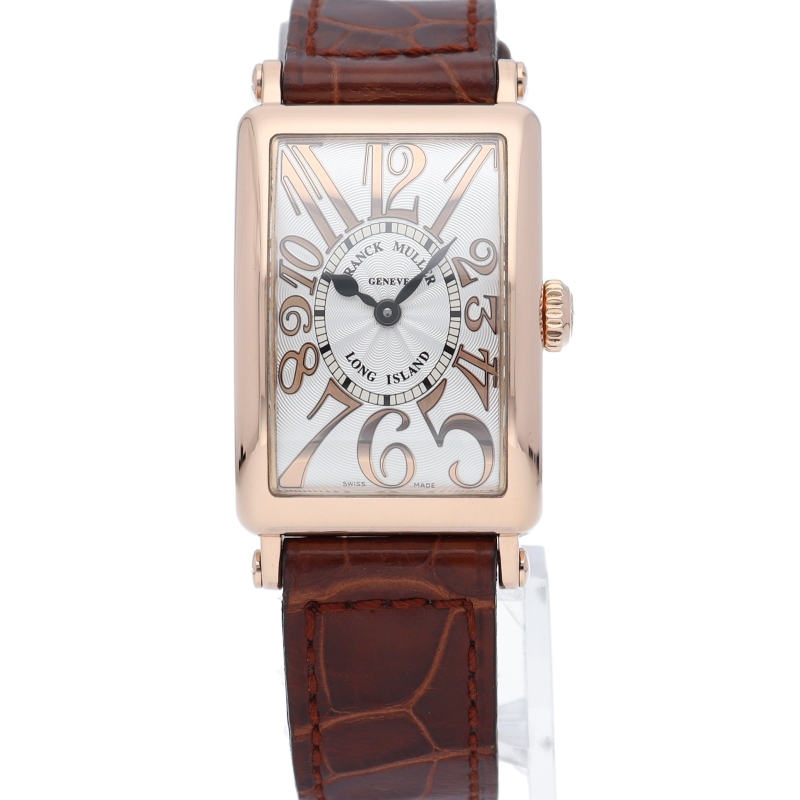 フランクミュラーの中でも特に人気のある「ロングアイランド」。シルバー文字盤とブラックレザーの組み合わせが落ち着いた印象を与える一本です。