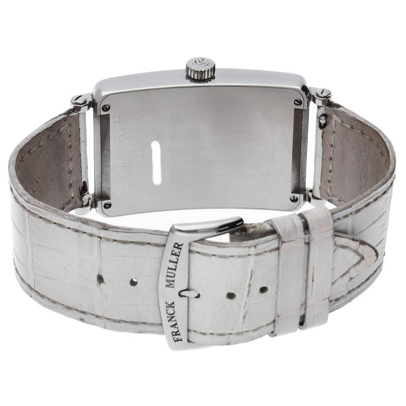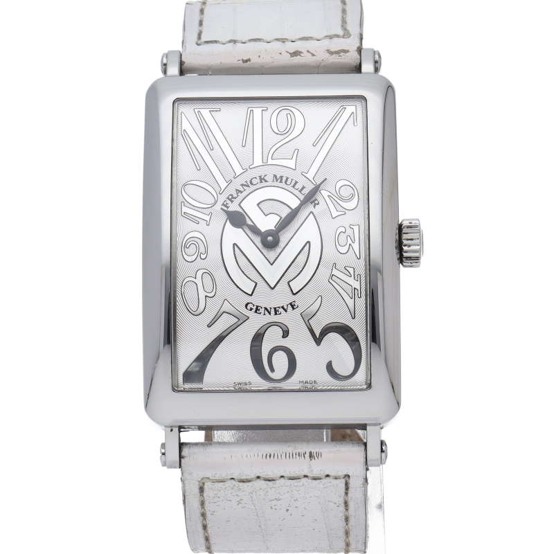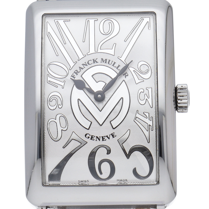 フランクミュラーの中でも特に人気のある、レクタンギュラケースならではの存在感が際立つロングアイランド。ダイヤル全面に広がるビザン数字やスペード型の時針など、1900年代初頭に一世を風靡したアールデコを髣髴とさせるクラシカルなデザインが特徴的です。こちらはダイアル中央にフランクミュラーの「FM」ロゴがセットされた特別仕様です。