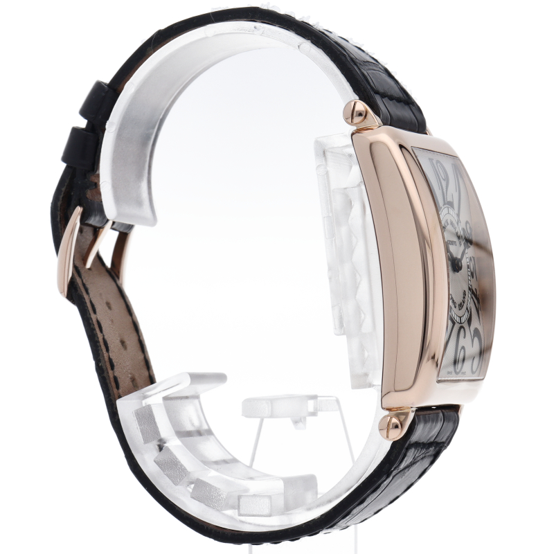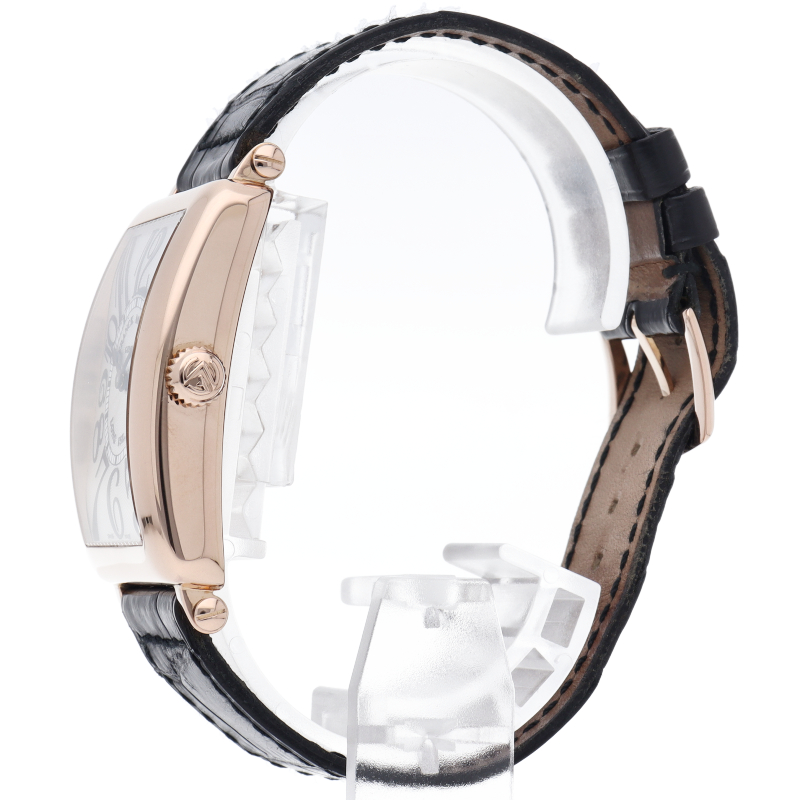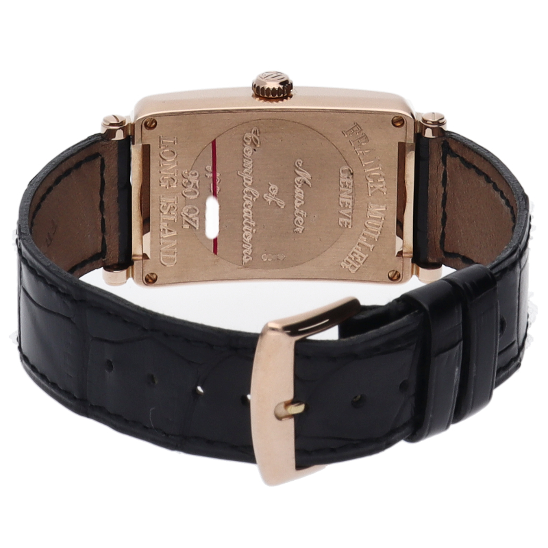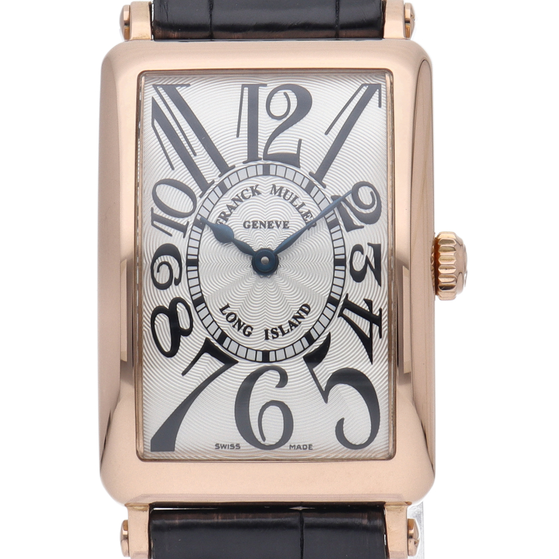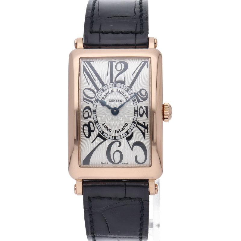 フランクミュラーの中でも特に人気のある、レクタンギュラケースならではの存在感が際立つロングアイランド。一目でフランクミュラーと分かるギョーシェ文字盤と、個性的なアラビアインデックスが印象的です。
