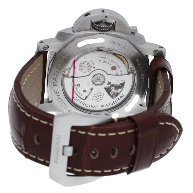 PAM00320のマイナーチェンジモデル「ルミノール 1950 3デイズ GMT」。ムーブメントにはデイト表示機能の他にGMT機能、ゼロリセットセコンド機能を備えた自社開発キャリバー「P.9011」を搭載します。サファイアケースバックからは3日間のパワーリザーブインジケーターを備えたムーブメントがご覧になれます。