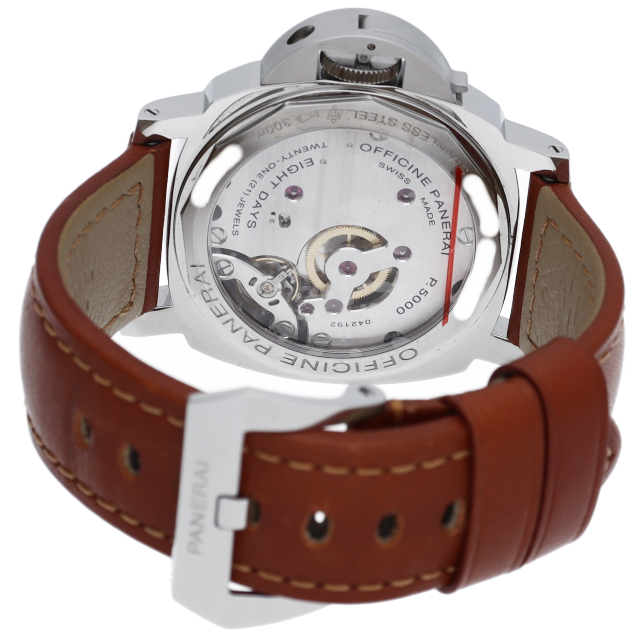 8日間パワーリザーブと手巻きムーブメント。P.5000手巻きキャリバーには、イタリア海軍の軍事作戦用に初めて開発されたモデル以降、パネライウォッチの歴史の一部を成してきたこれらの2つの特性が組み合わされています。レトロ感を出しつつ8デイズを実現したハイブリッドな一本です。OP7031。