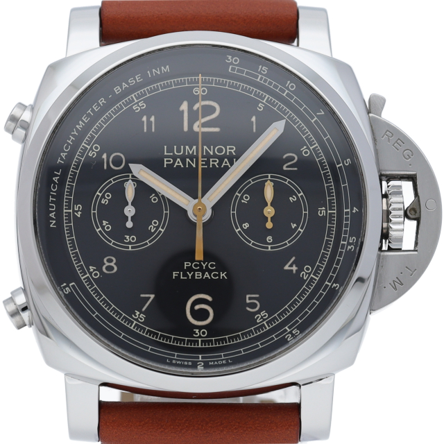 2017年新作 ”PCYC”(PANERAI CLASSIC YACHT CHALLENGE)がモデル名になったレガッタモデル。ラップタイムの計測が可能なフライバッククロノグラフ機能。キャリバー「P.9100」搭載。。3日間パワーリザーブ。
