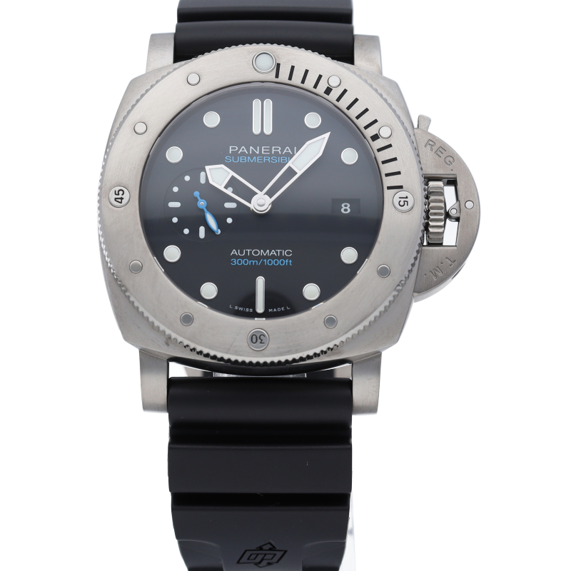 パネライの中でもスポーティーで気骨な印象を持つ「サブマーシブル」。特徴的な逆回転ベゼル、デイト表示機能と実用性とデザイン性を兼ね備えた1本。OP7258。