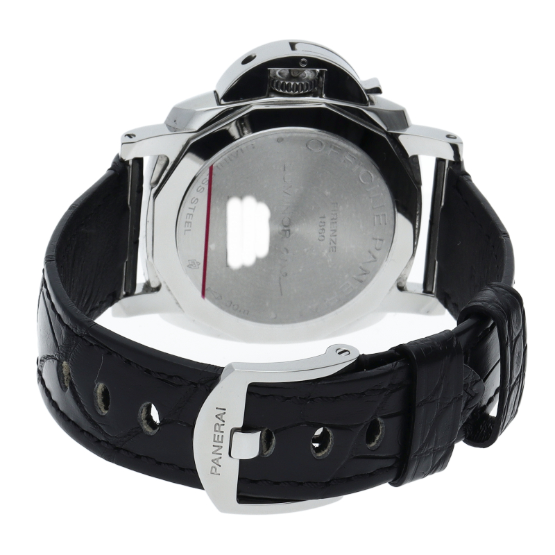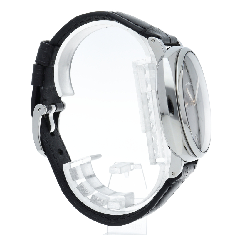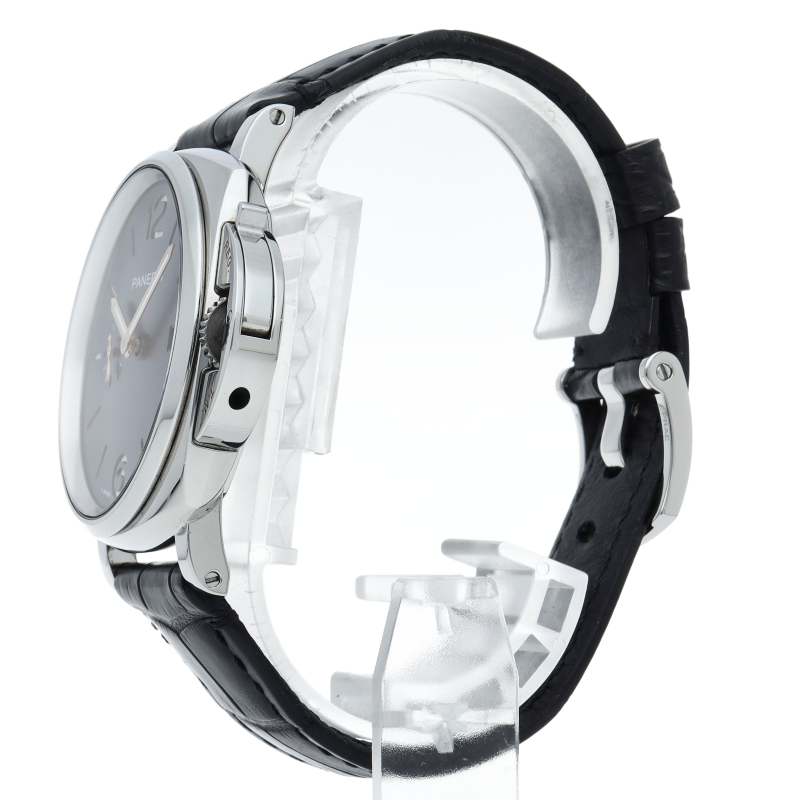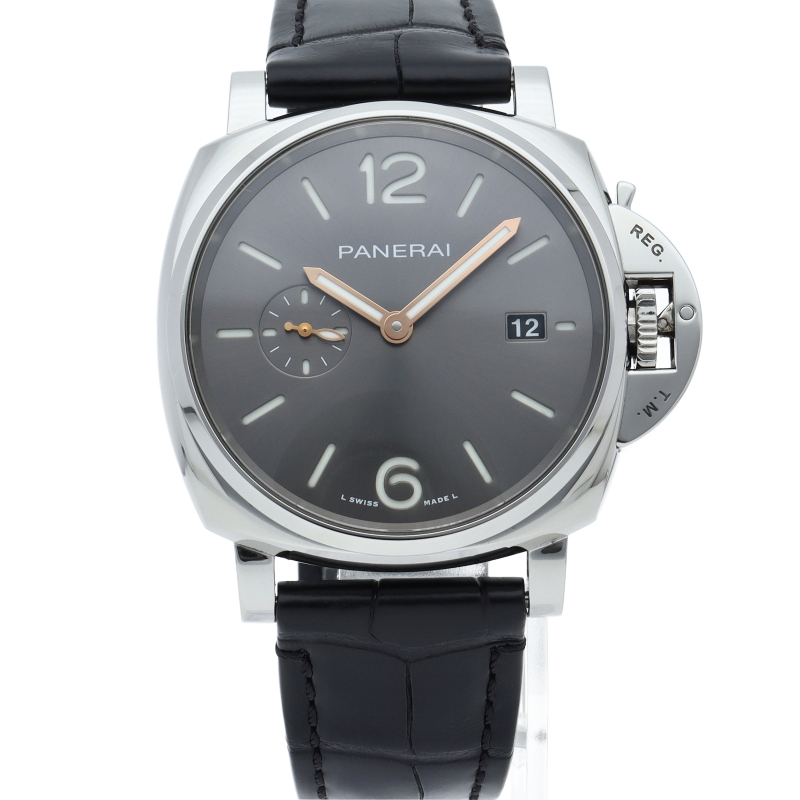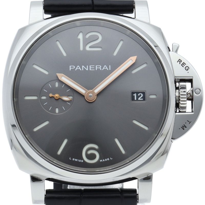 パネライの数あるモデルの中でも薄いケースが特徴の「ルミノール ドゥエ」シリーズ。こちらの「ルミノール ドゥエ42mm」は、ケース径42mmのステンレスケースと美しいアンスラサイトダイアルを合わせたモデル。文字盤は2層式のサンドイッチ構造となっており、上側のインデックス部分をくり抜いた文字盤の下にはルミノバを塗布した文字盤を重ね合わせています。