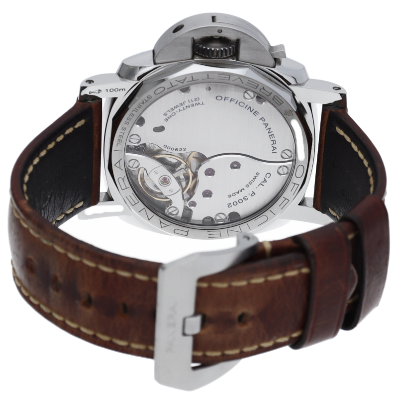 パネライの自社開発手巻きムーブメント「Cal.3002」を搭載したモデル。3日間のパワーリザーブ機能とパワーリザーブインジケータを備え、機能性とデザイン性を兼ね備えた1本。OP6893。