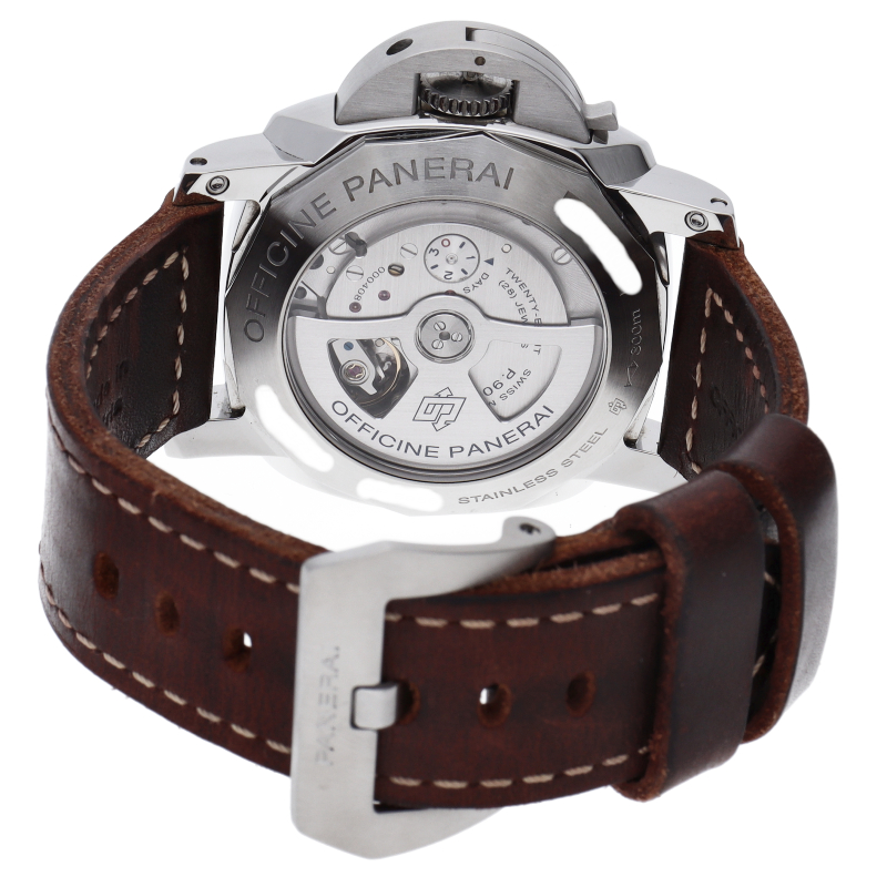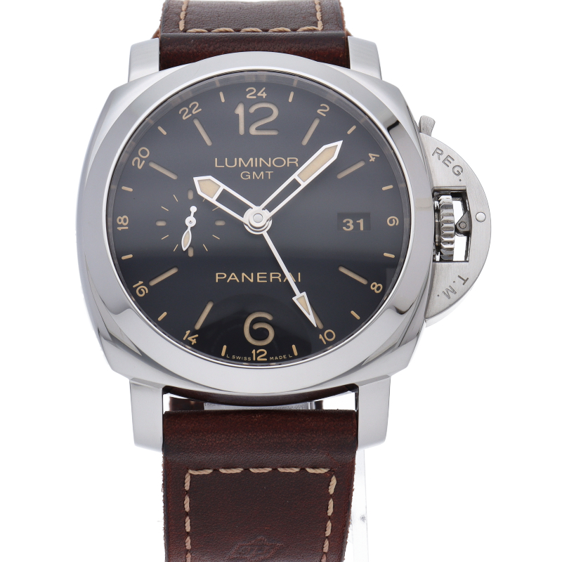 ルミノール1950 3デイズGMT 24Hオートマチック アッチャイオです。この時計に搭載されているムーヴメントP.9003は、独立した針によって第2時間帯を表示し、新たな円形パワーインジケーターを裏側に備えています。また、12時間表示から24時間表示となり、視認性・利便性共に向上しています。