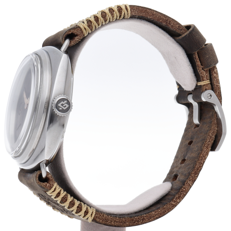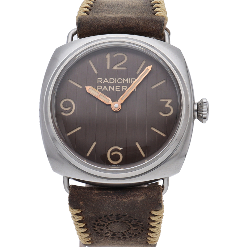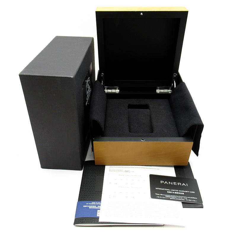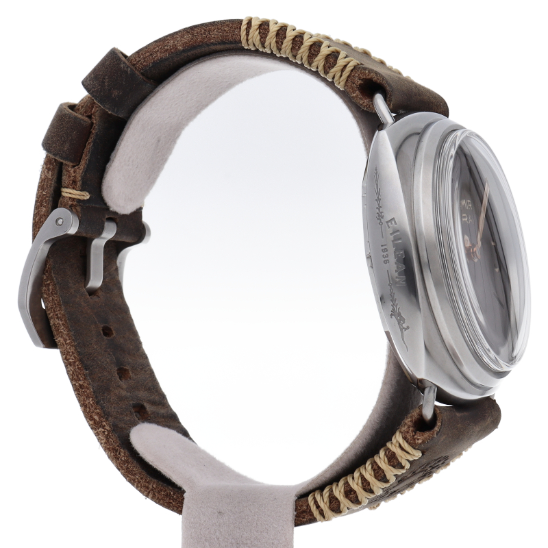 1938年軍事用として開発された腕時計「ラジオミール」。こちらは伝説のヨット「アイリーン(EILEAN)号」に敬意を表し制作された、自社製手巻きキャリバーP.6000を搭載したモデルです。ヨットの床に見立てたダイアルが特徴的で、ケースサイドにもアイリーン号のドラゴンの模様が施されています。OP7439。