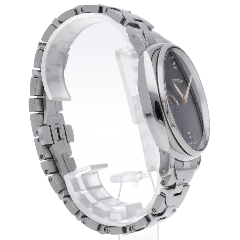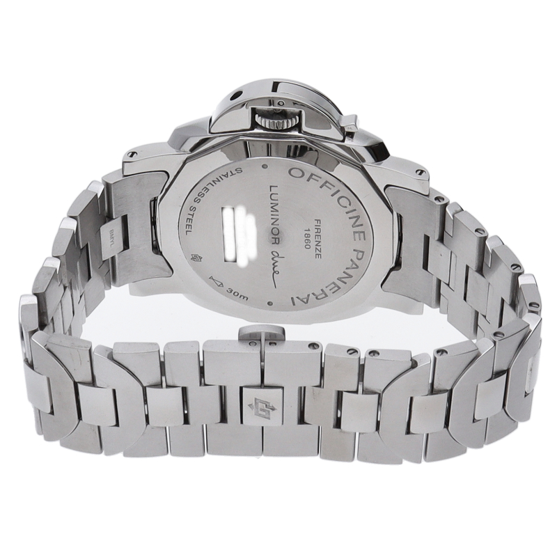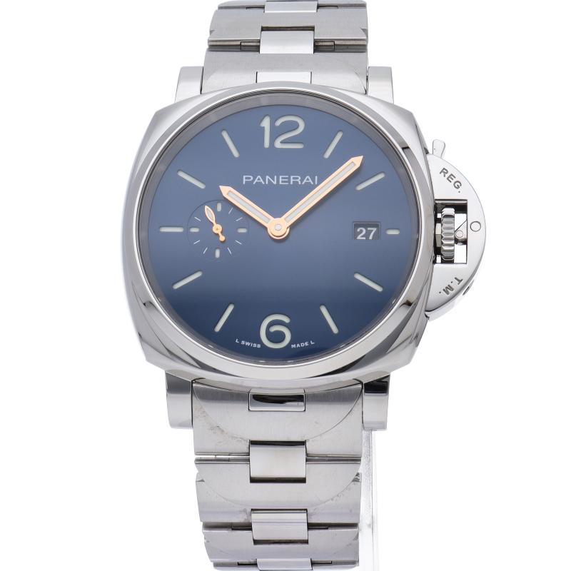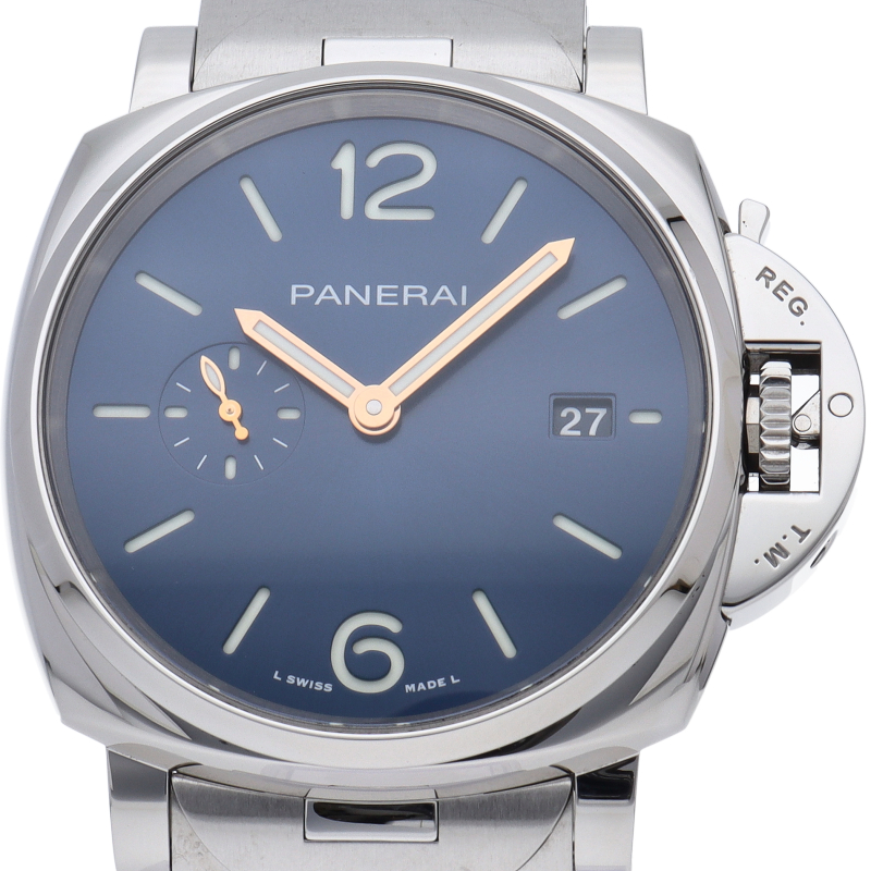 パネライの数あるモデルの中でも薄いケースが特徴の「ルミノール ドゥエ」シリーズ。2021年発表のこちらの「PAM01124 ルミノール ドゥエ42mm」は、ケース径42mmのステンレスケースとステンレスベルトで美しいブルーダイアルを合わせたモデル。