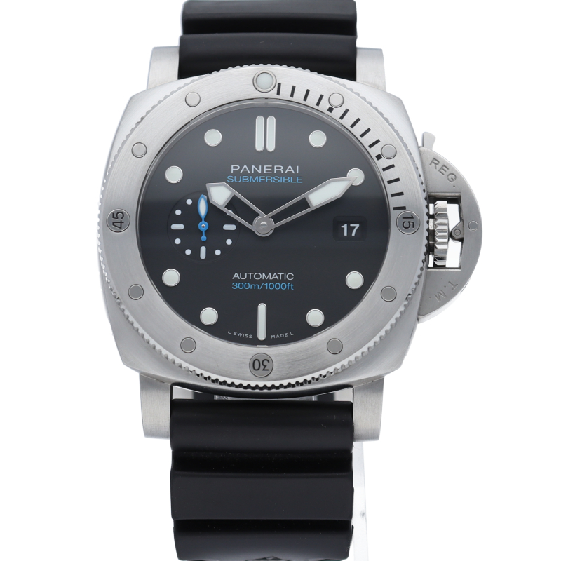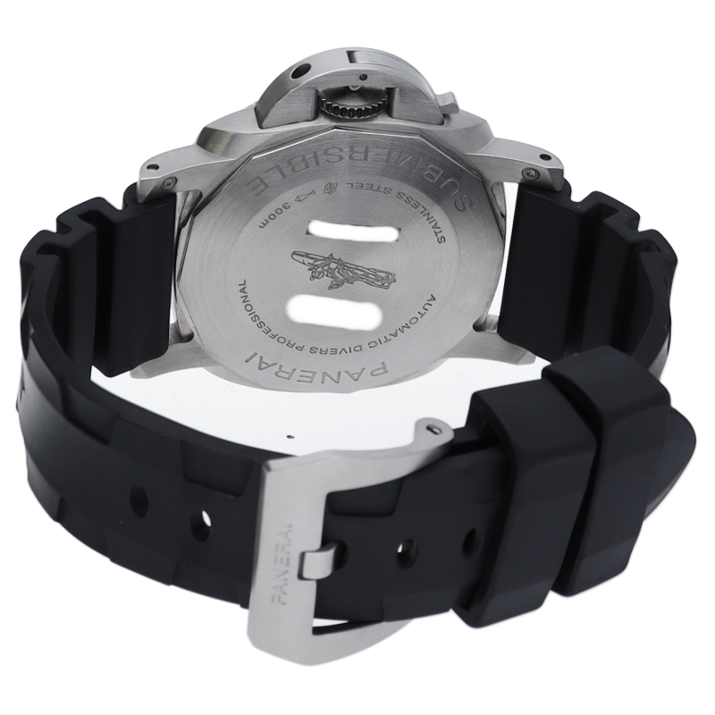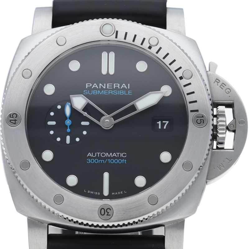 2022年発表のケース径44mmのPAM01229 サブマーシブル クアランタクアトロ。プロフェッショナルダイバーウォッチとして充分な300m防水を確保して、ムーブメントにも3日間のロングパワーリザーブを誇るキャリバーP.900を搭載。パネライウォッチの特徴でもあるリューズプロテクターはそのままに、ダイビンググローブを着けたままでも操作性の良い逆回転防止ダイビングベゼルを装備します。OP7482。