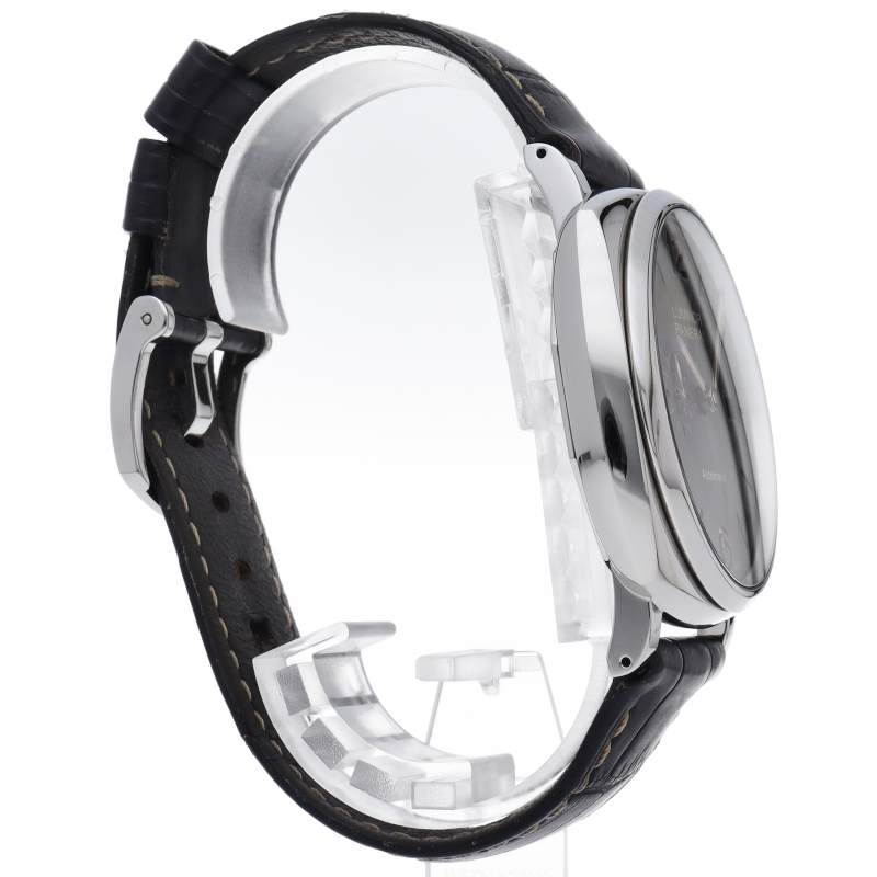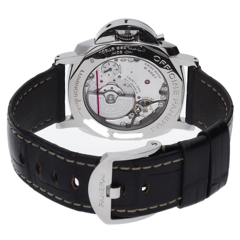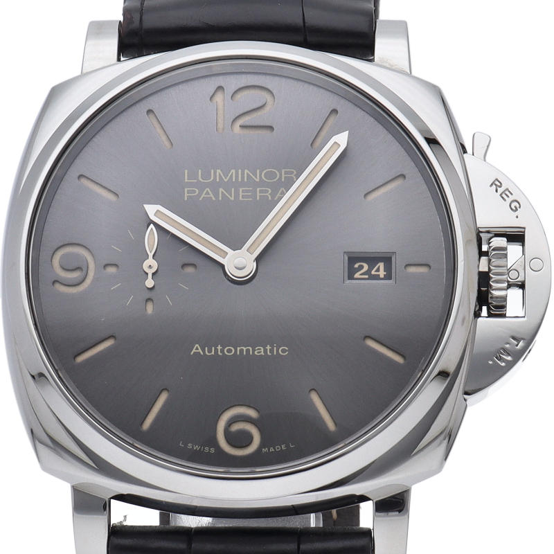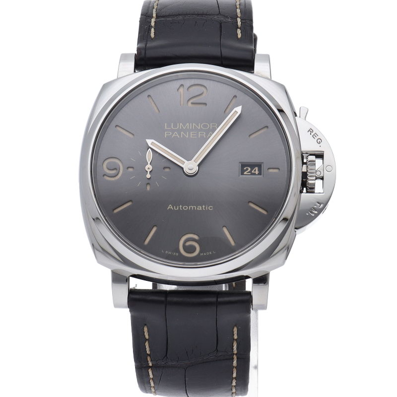 パネライの数あるモデルの中でも薄いケースが特徴の「ルミノール ドゥエ」シリーズ。こちらの「ルミノール ドゥエ45mm」は、ケース径45mmのステンレスケースと美しいアンスラサイトダイアルを合わせたモデル。文字盤は2層式のサンドイッチ構造となっており、上側のインデックス部分をくり抜いた文字盤の下にはルミノバを塗布した文字盤を重ね合わせています。