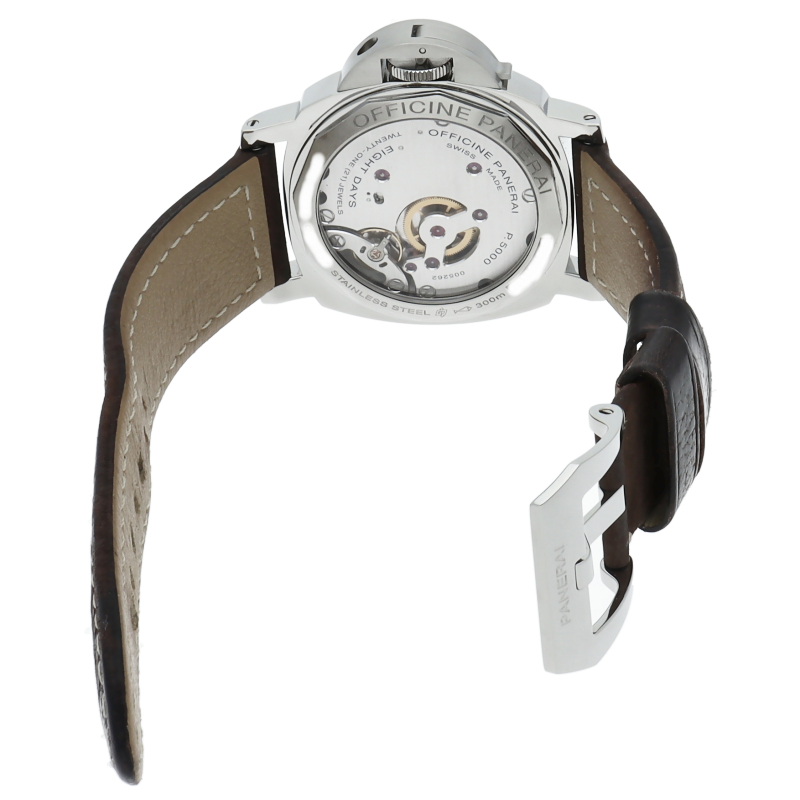 8日間パワーリザーブと手巻きムーブメント。P.5000手巻きキャリバーには、イタリア海軍の軍事作戦用に初めて開発されたモデル以降、パネライウォッチの歴史の一部を成してきたこれらの2つの特性が組み合わされています。レトロ感を出しつつ8デイズを実現したハイブリッドな一本です。OP7031。