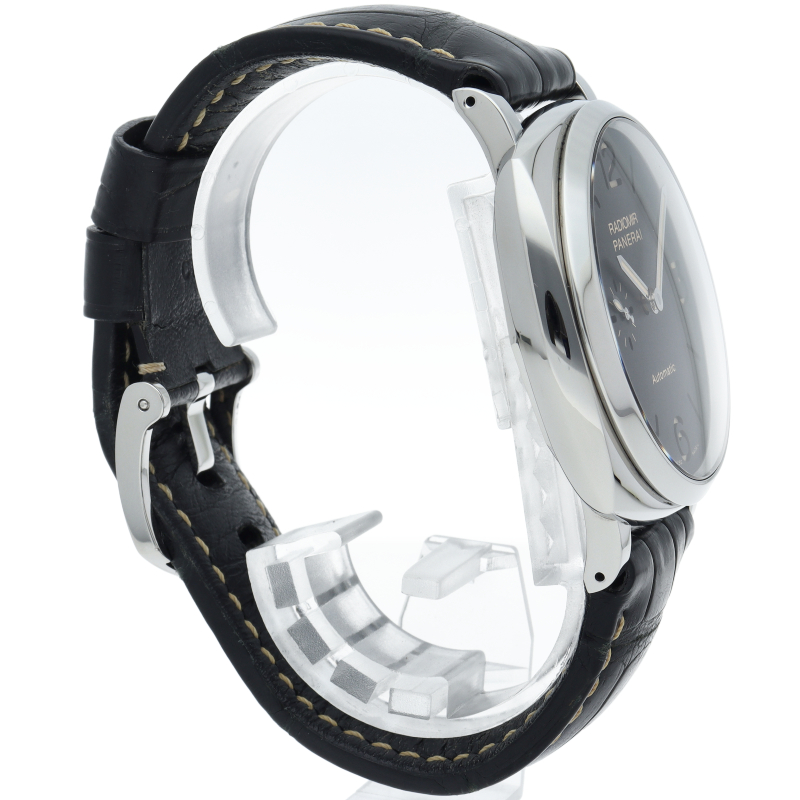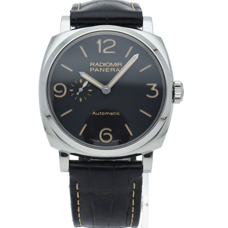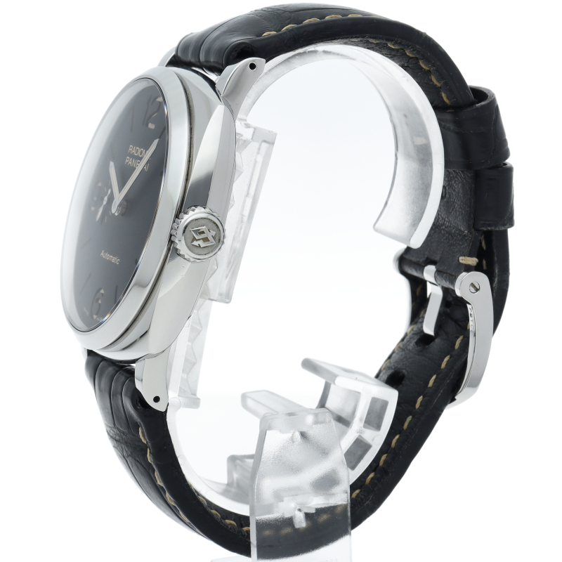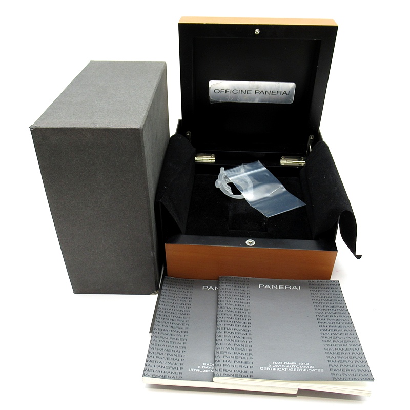 ラジオミールからルミノールに移行する間に生産されていた「ラジオミール1940」の復刻モデル。搭載されているP.4000はマイクロローターを採用しておりオートマティックモデルでありながら薄いケースデザインとなっています。マイクロローター唯一の弱点となっている、巻き上げ効率の悪さはタングステンを採用する事により改善しています。