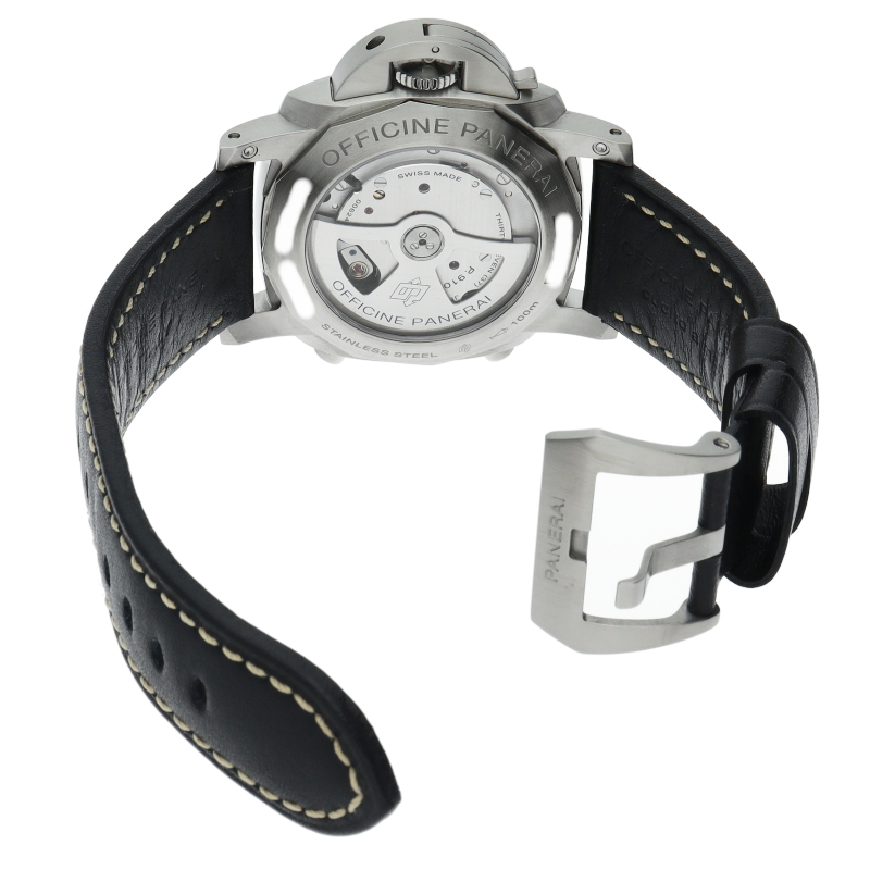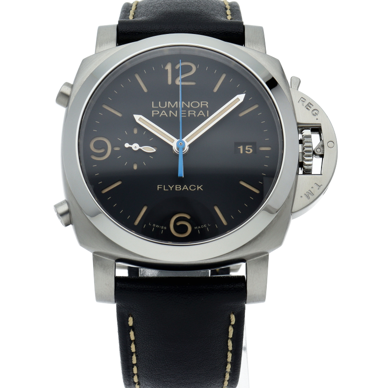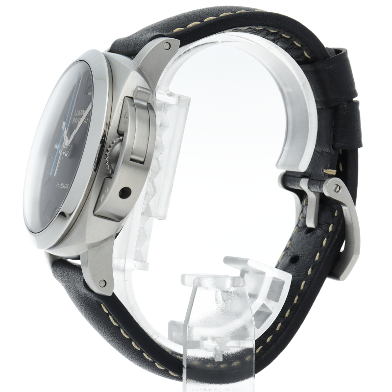 フライバック機能を備えたクロノグラフで、パネライがマニュファクチュールで開発・製造したP.9100キャリバーを用いた初の時計です。フライバック機能とは8時位置のボタンを押すだけで、クロノグラフ針をゼロ位置に戻すと同時に再スタートできる機能です。