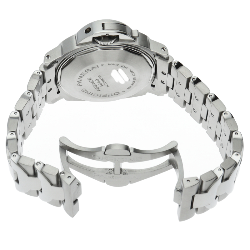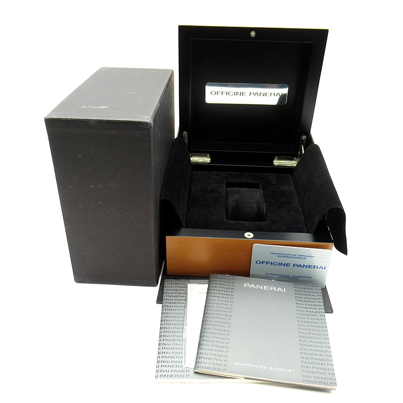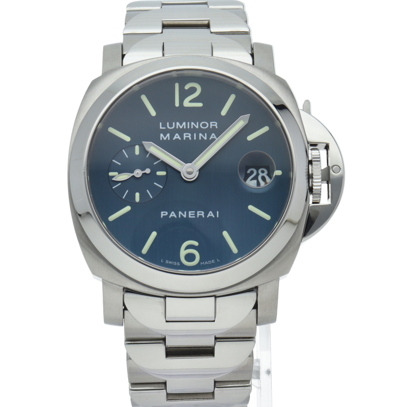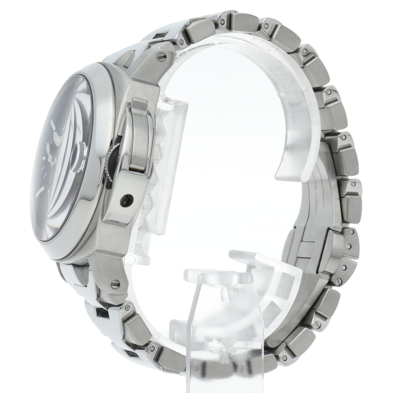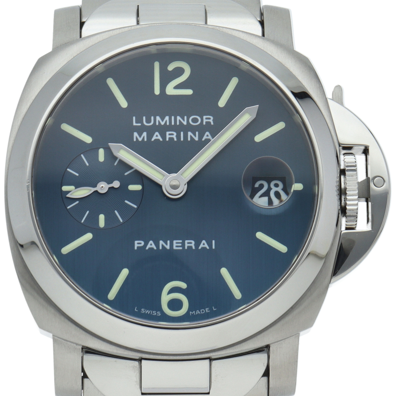 落ち着いた雰囲気のルミノール マリーナです。9時位置にスモールセコンド、3時位置にデイト表示を配置。針に蛍光塗料を使用しているため薄暗い中でもしっかり時間が読み取れます。パネライとしては小振りな40mmサイズのため、女性にもお勧めできるモデルです。