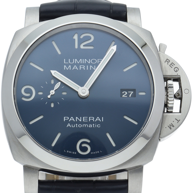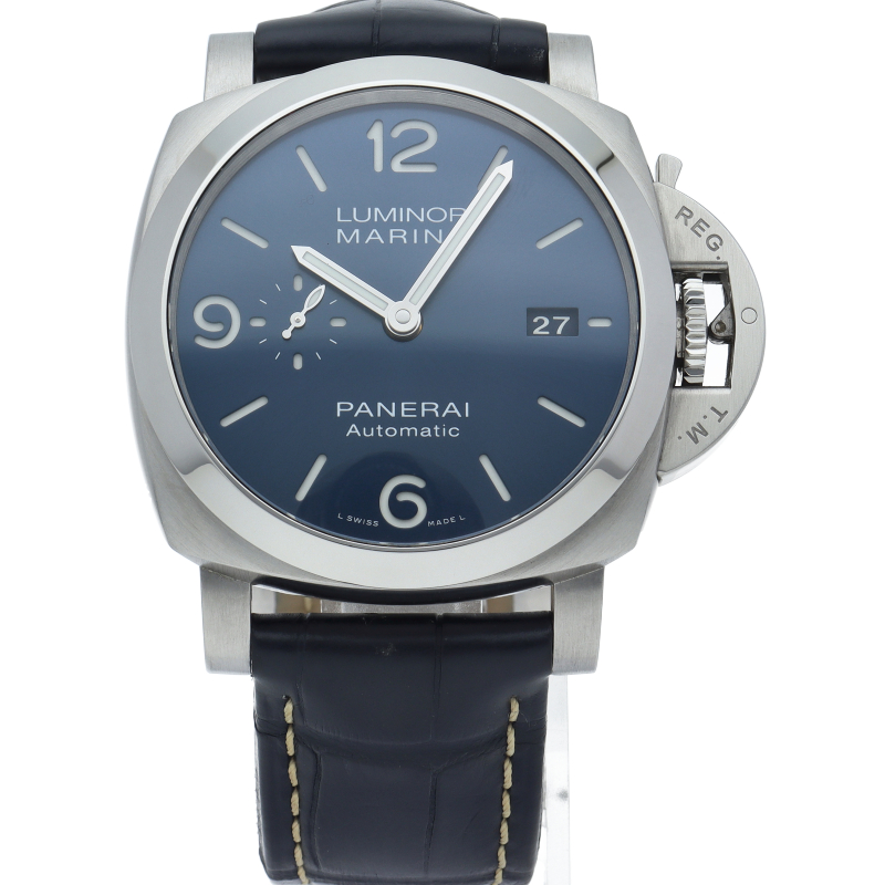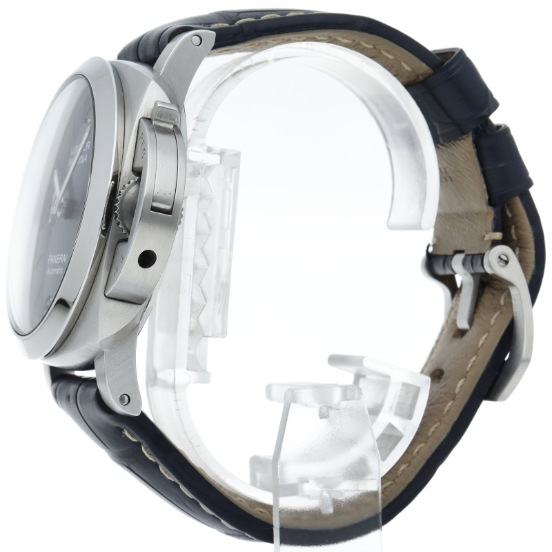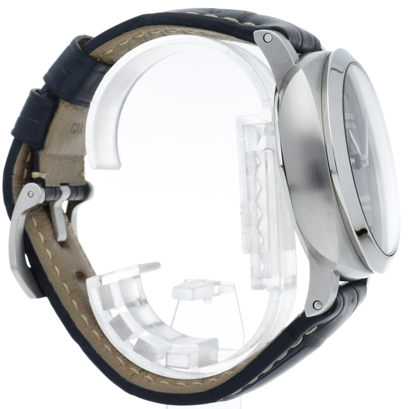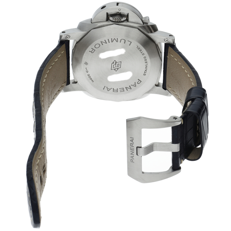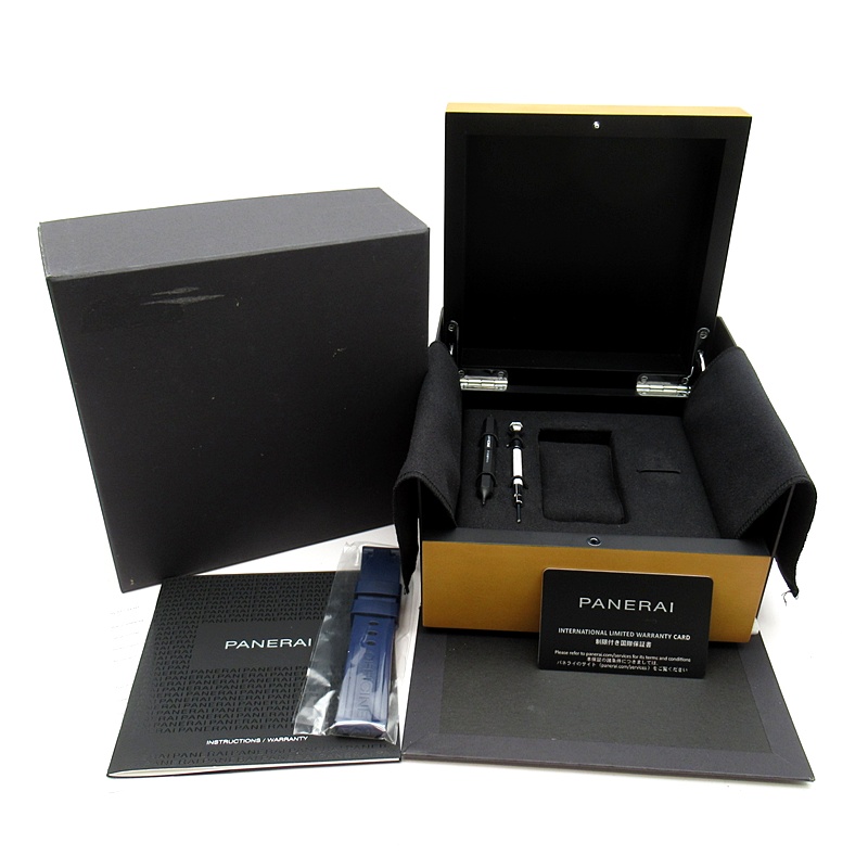パネライのマニュファクチュールで開発・製造した自社製P.9010 キャリバーは、中央に時針と分針、9時位置にスモールセコンド、3時位置に日付表示を備えています。時針だけを1時間ずつ前後にジャンプさせる機能で、分針の動きに妨げられることなく時間を調整することが可能です。この機能は、タイムゾーンが変わる際や夏時間と冬時間の間を移動する際に非常に便利です。OP7393。