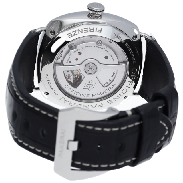 自社キャリバーP9000を搭載した初めてのラジオミール。今まではルミノールのみに搭載されていましたので、待望のモデルとしてお待ちになっていた方も多いのではないでしょうか。シースルーバックを採用し、自慢のキャリバーを眺めることができます。OP6848。