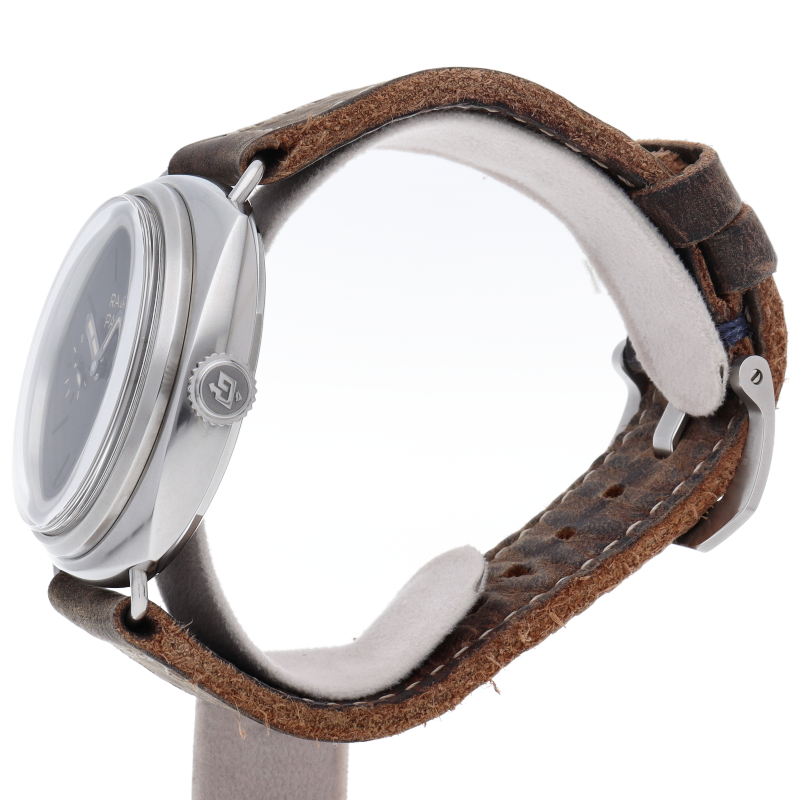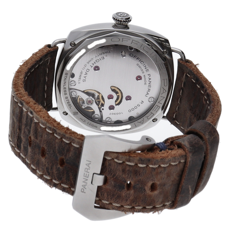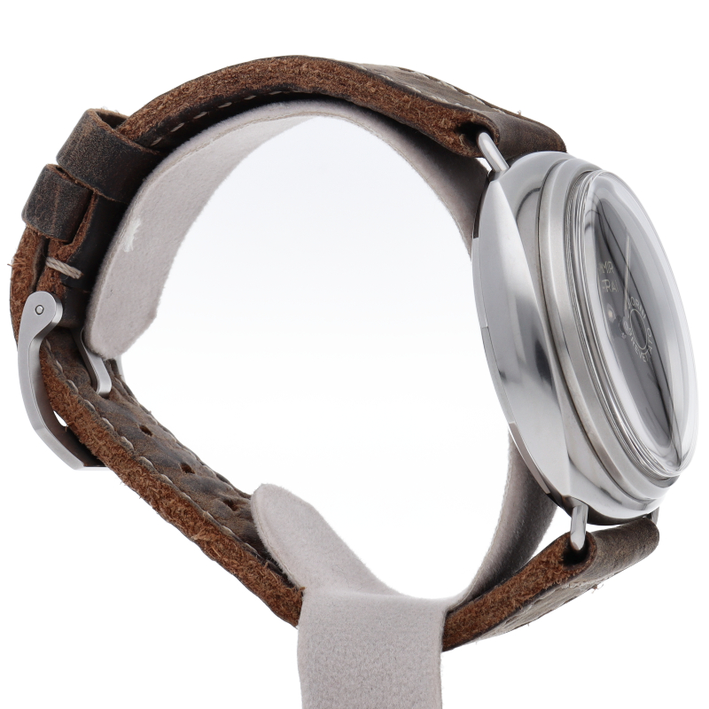 1938年、軍事用として開発された伝説の腕時計「ラジオミール」。こちらは自社製手巻きキャリバーP.5000を搭載した、2019年にブティックで限定発売されたモデルです。ツインバレルによる8日間のパワーリザーブを確保。少し光沢の残るティーナスチールのケースと、青焼きされたスティール製の針を採用し、高級感溢れるデザインになっております。