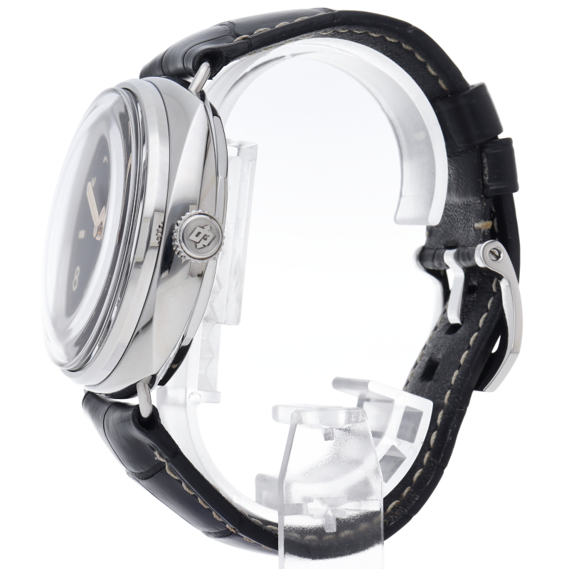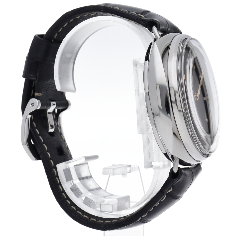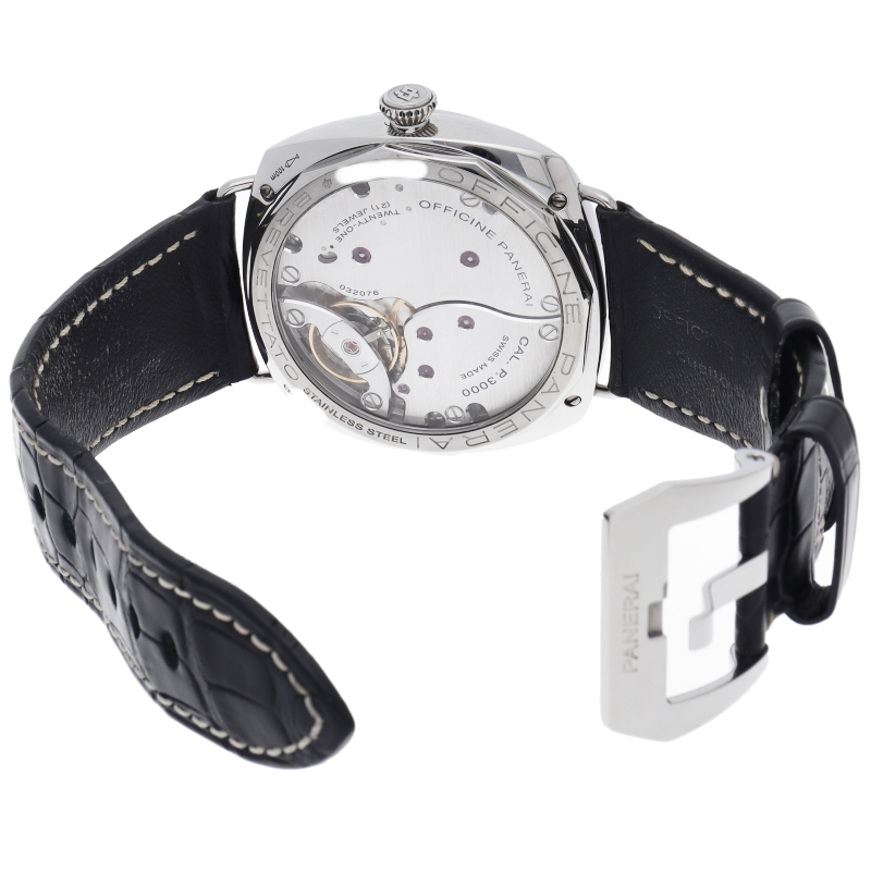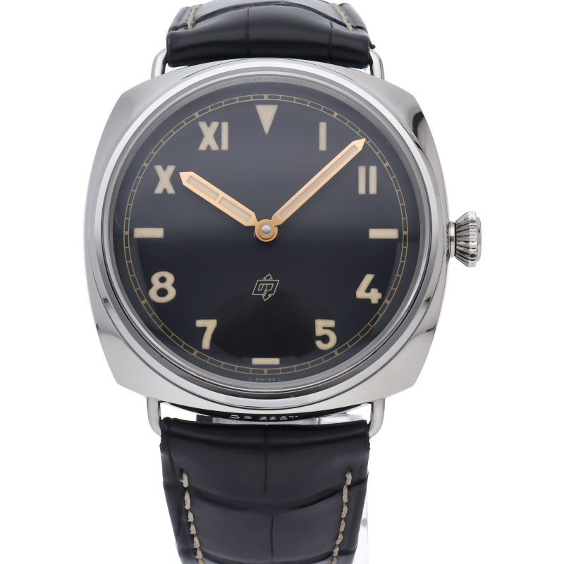 1930年代にパネライがイタリア海軍からの要請で作成したモデルにインスピレーションを受けて誕生した2012年の新作モデルの「ラジオミール カリフォルニア 3デイズ」。インデックスの上半分はローマ数字、下半分はアラビア数字が配され、文字盤にはインデックス以外にOPロゴしかないため、スッキリした印象を受けます。ツインバレルで3日間のパワーリザーブに対応の自社製造手巻きムーブメント搭載。OP6837。