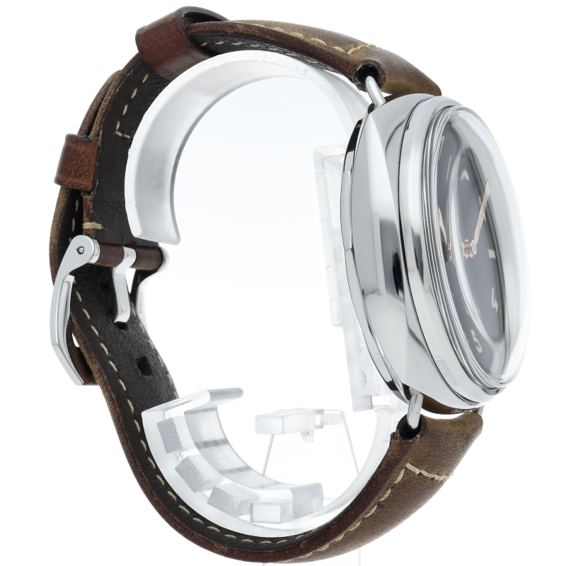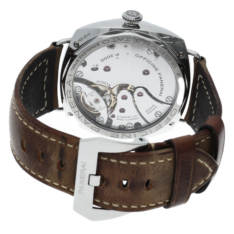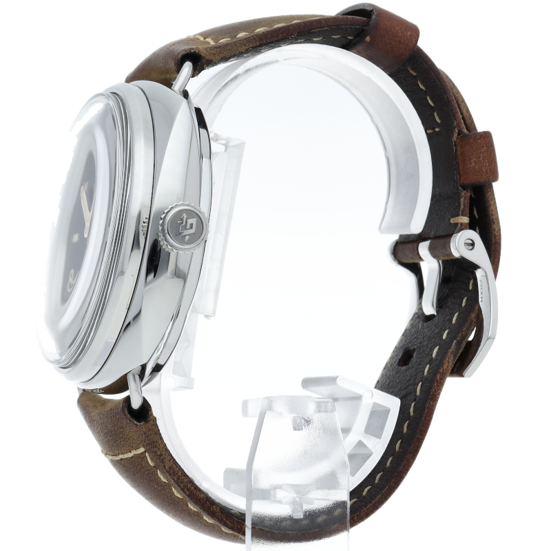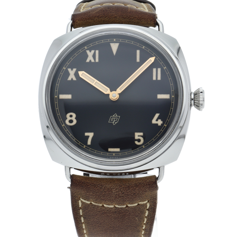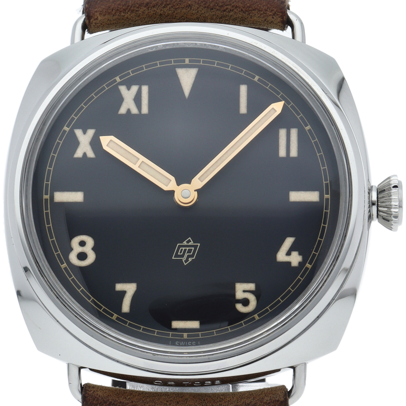1930年代にパネライがイタリア海軍からの要請で作成したモデルにインスピレーションを受けて誕生した2012年の新作モデルの「ラジオミール カリフォルニア 3デイズ」。インデックスの上半分はローマ数字、下半分はアラビア数字が配され、文字盤にはインデックス以外にOPロゴしかないため、スッキリした印象を受けます。ツインバレルで3日間のパワーリザーブに対応の自社製造手巻きムーブメント搭載。OP7068。